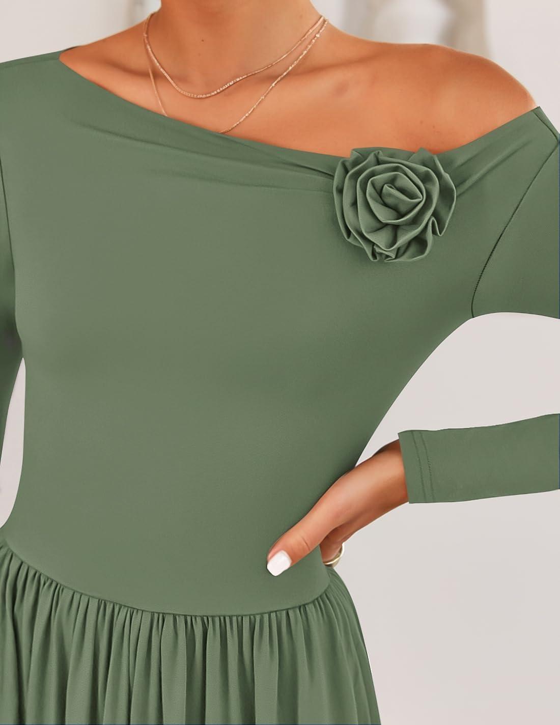 ZESICA Women's 2025 Fall Long Sleeve Off Shoulder Maxi Dress Pleated Elegant Formal Wedding Guest Dresses with Pockets(Beangreen)