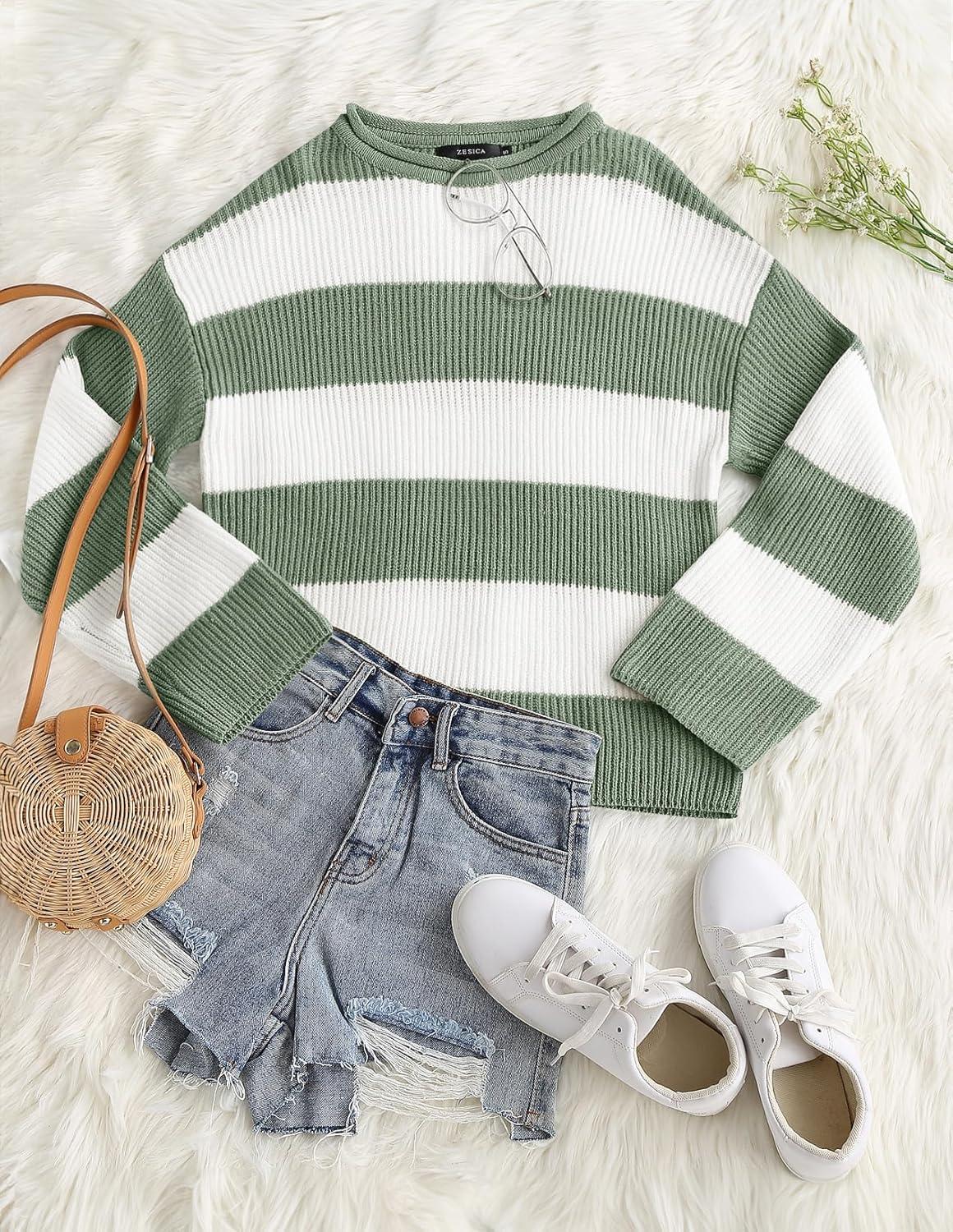 imageZESICA Womens 2025 Fall Long Sleeve Oversized Striped Color Block Comfy Loose Crew Neck Knitted Pullover SweaterGreen