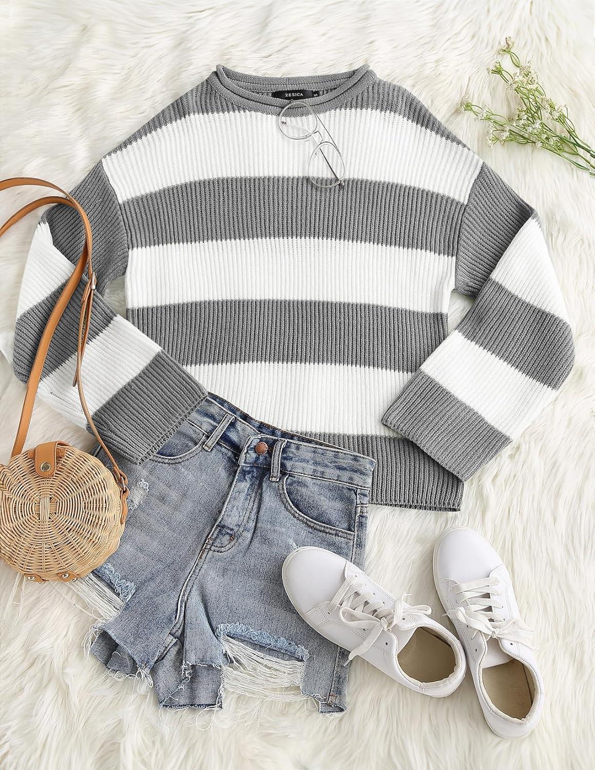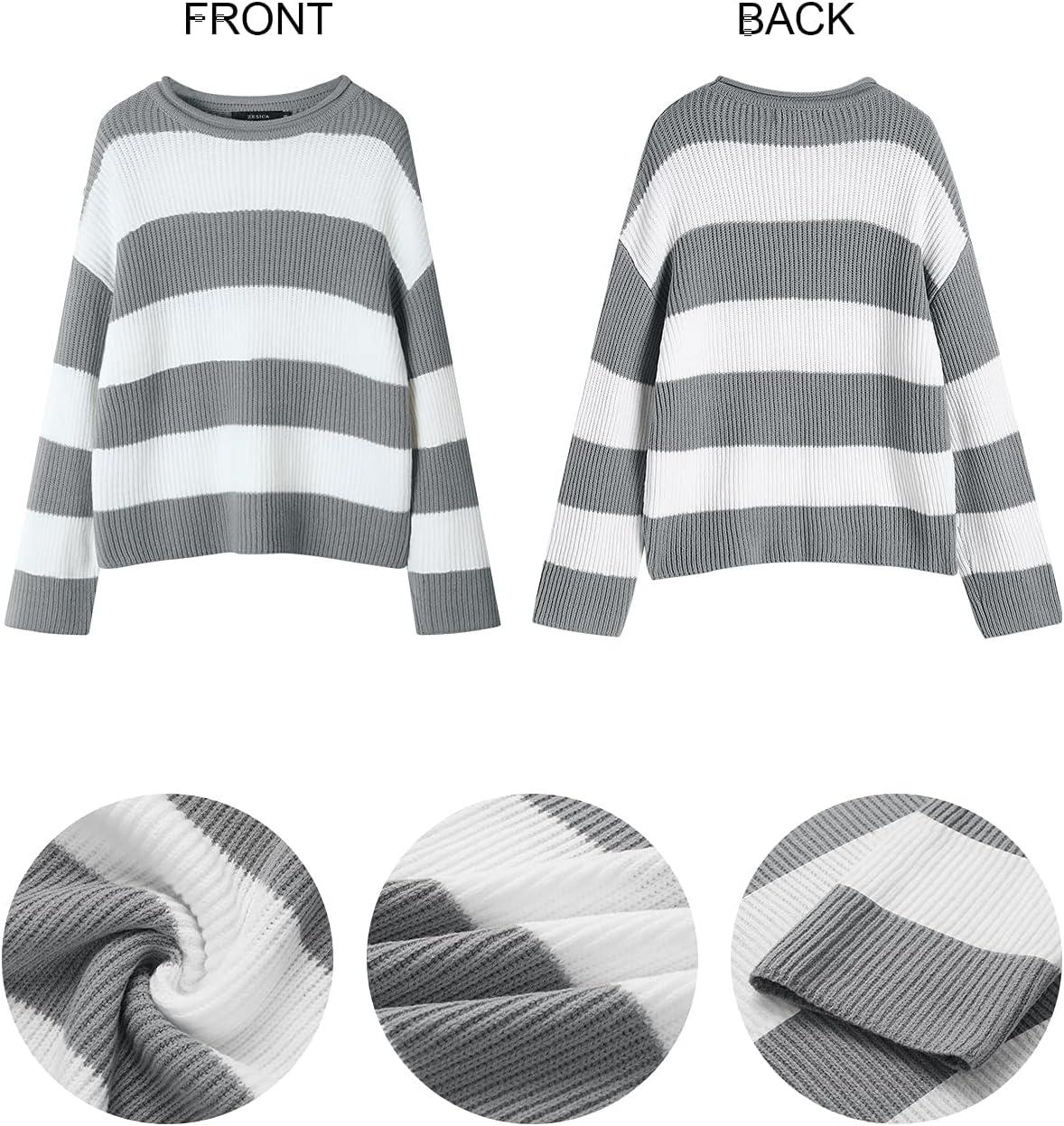 ZESICA Women’s 2025 Fall Long Sleeve Oversized Striped Color Block Comfy Loose Crew Neck Knitted Pullover Sweater(Grey)