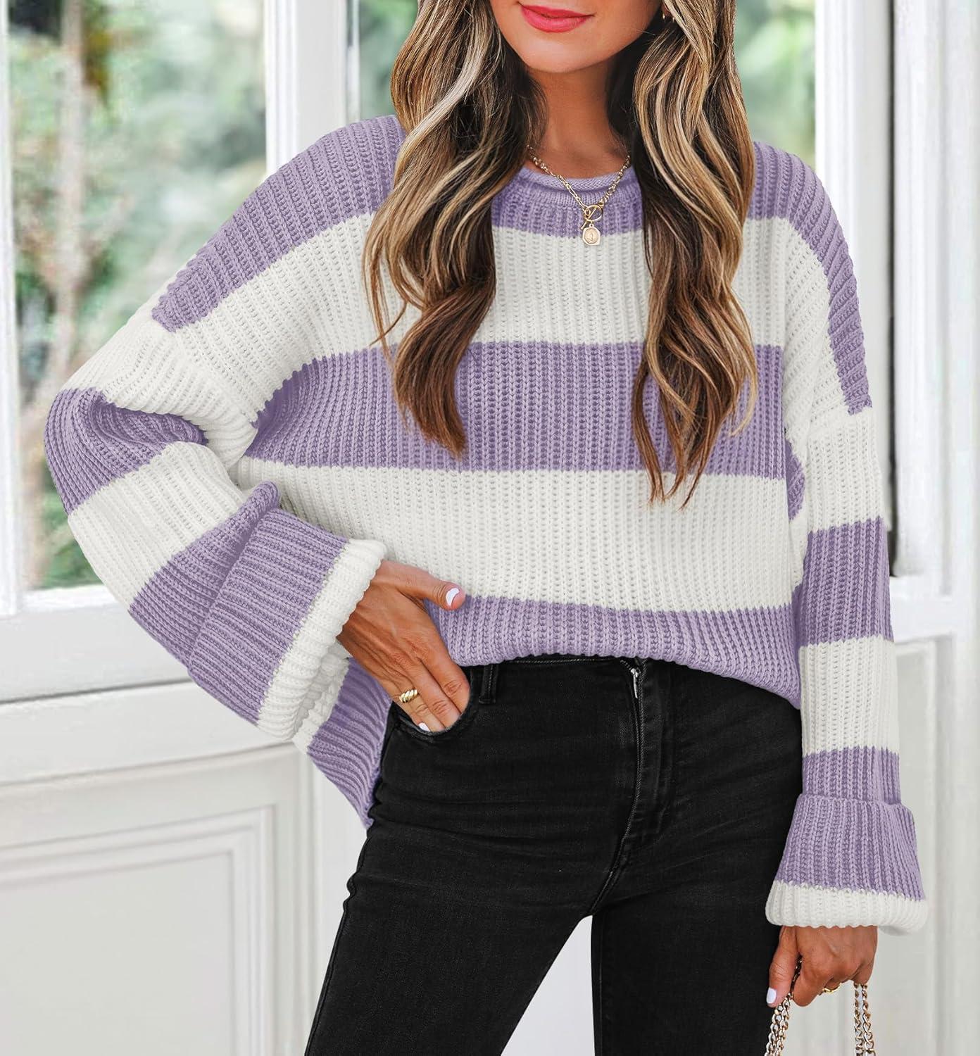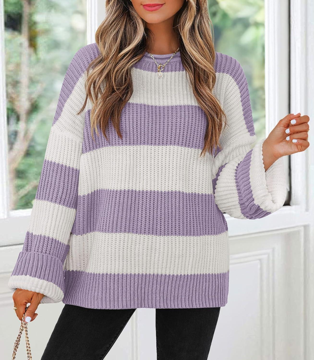 ZESICA Women's 2025 Fall Long Sleeve Oversized Striped Color Block Comfy Loose Crew Neck Knitted Pullover Sweater(Lightpurple)