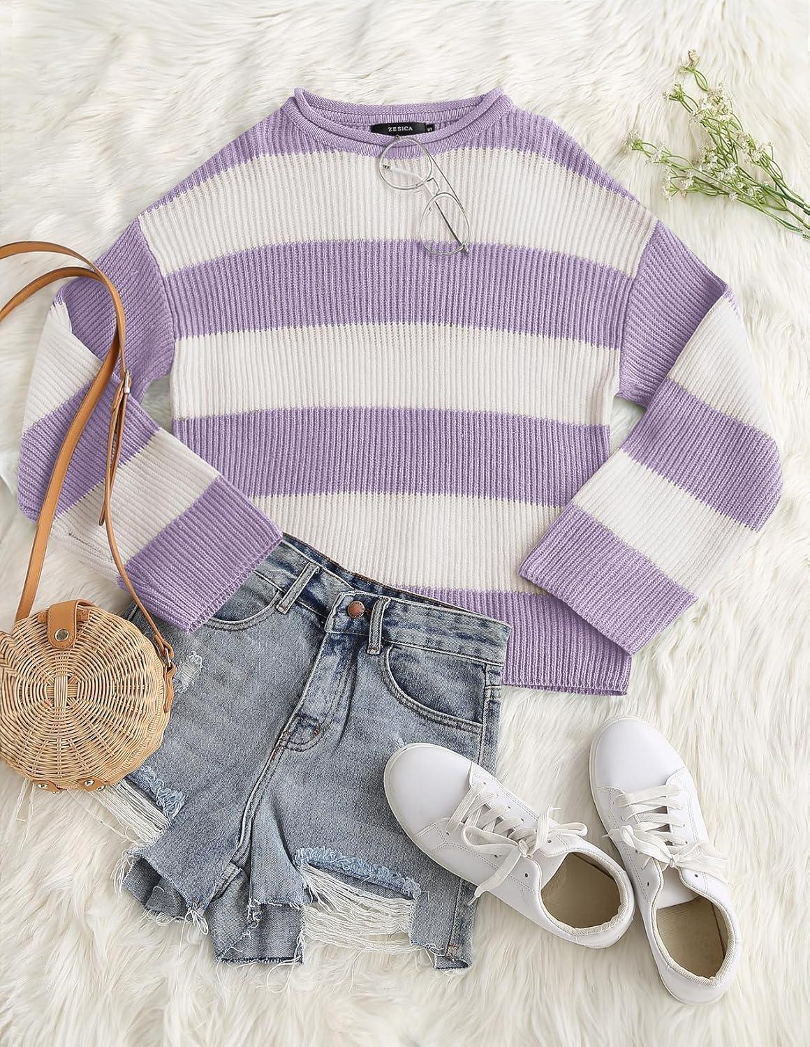 ZESICA Women’s 2025 Fall Long Sleeve Oversized Striped Color Block Comfy Loose Crew Neck Knitted Pullover Sweater(Lightpurple)