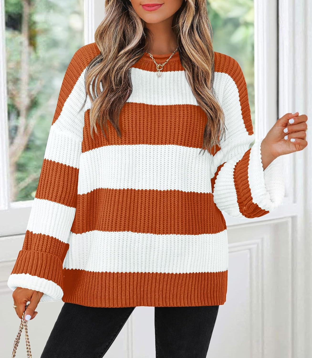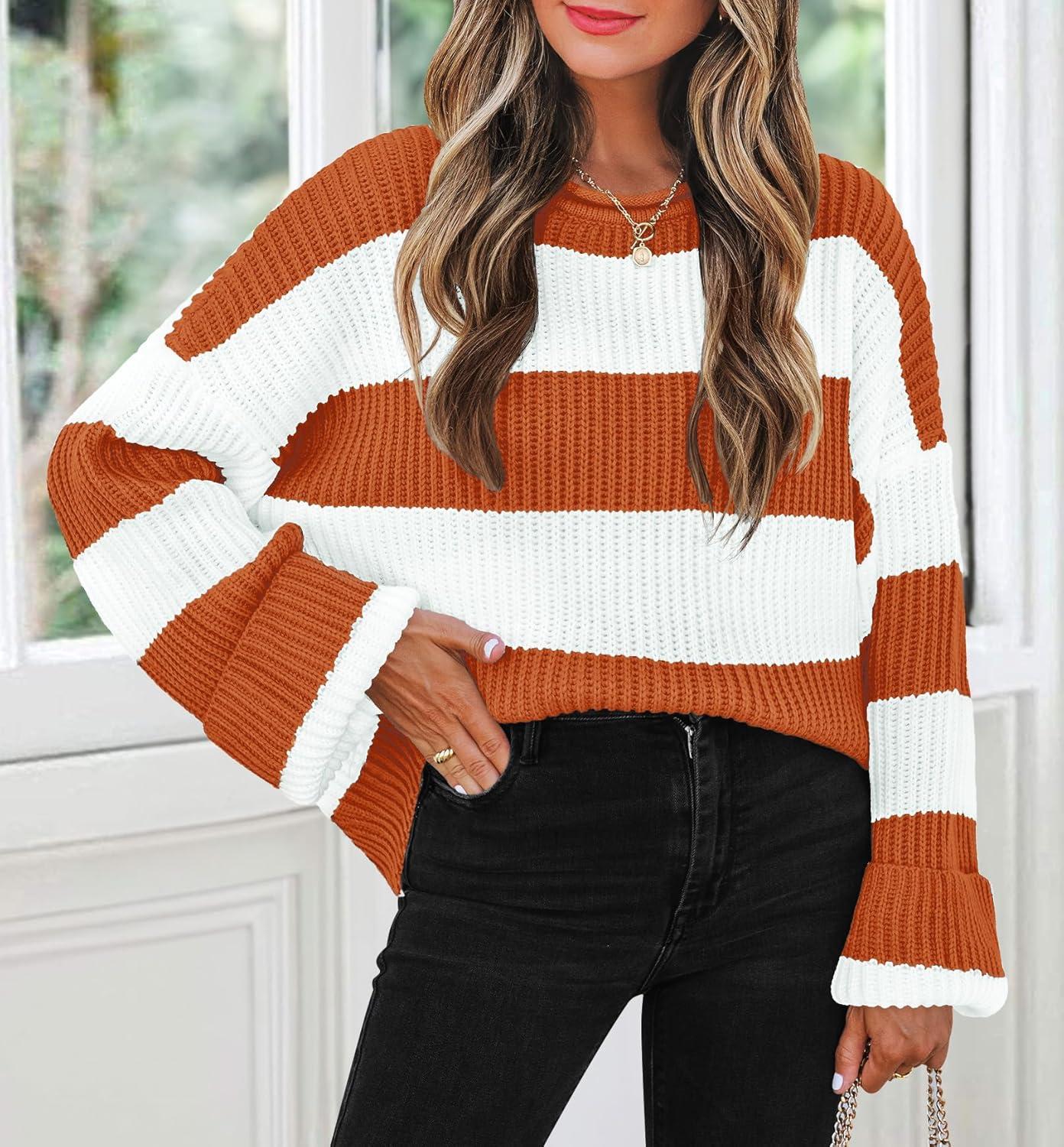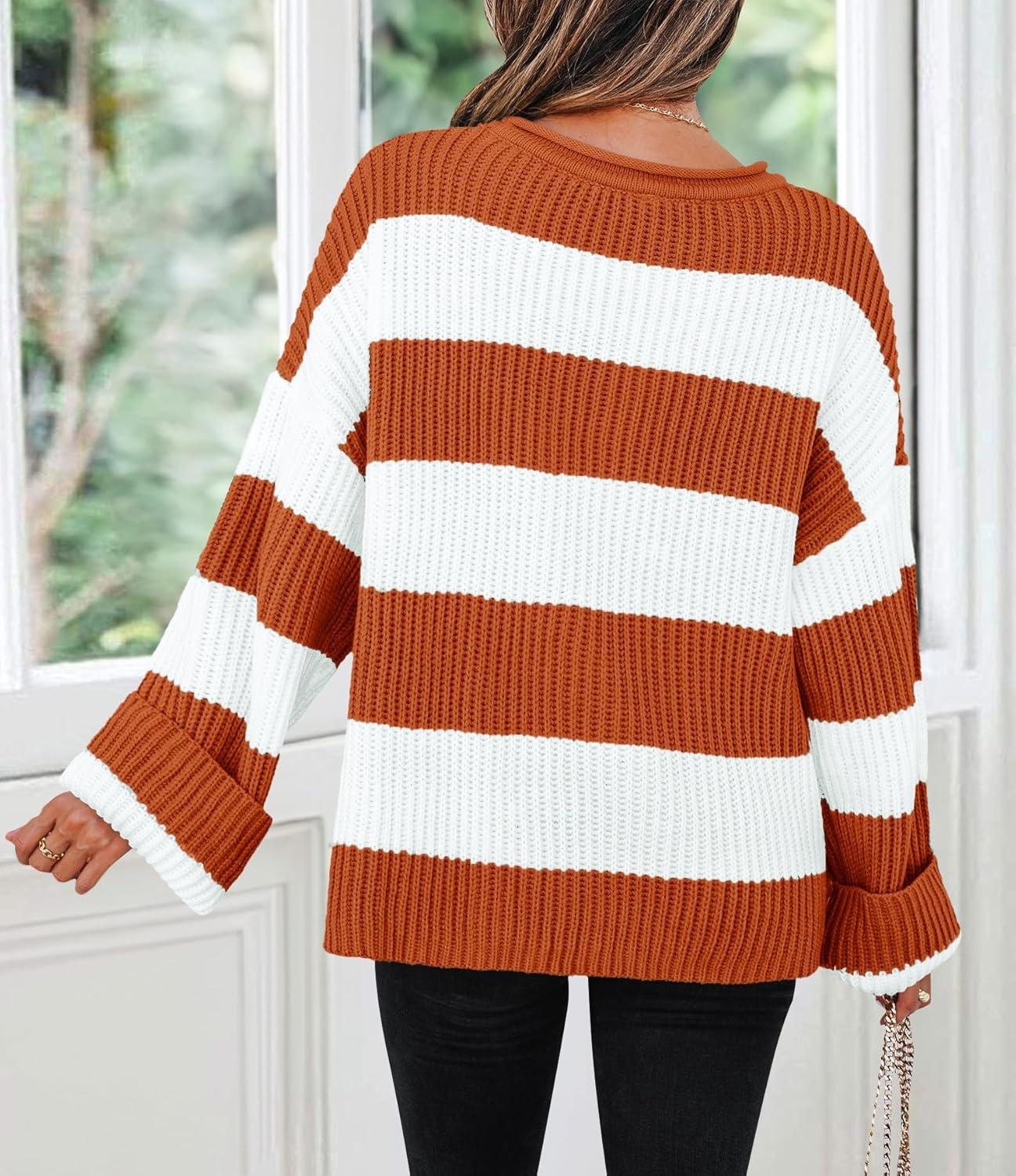ZESICA Women’s 2025 Fall Long Sleeve Oversized Striped Color Block Comfy Loose Crew Neck Knitted Pullover Sweater(Orange)