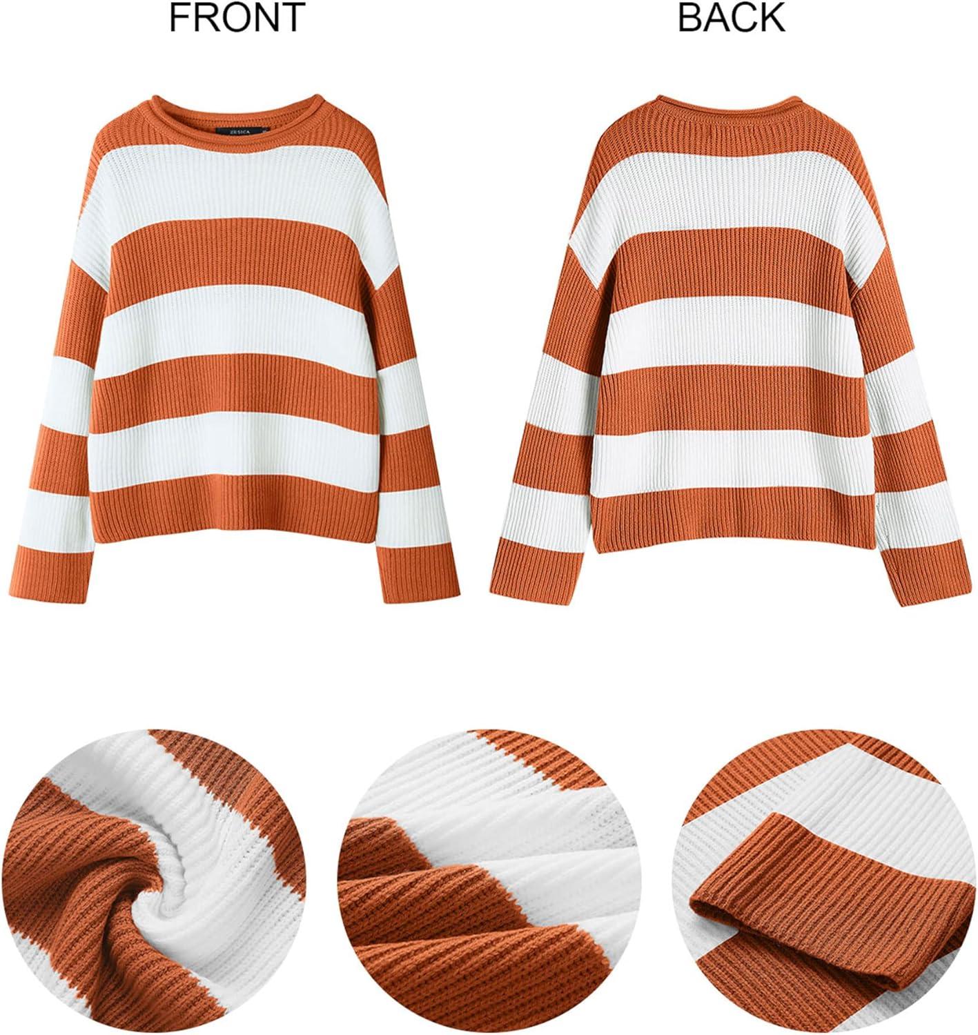 imageZESICA Womens 2025 Fall Long Sleeve Oversized Striped Color Block Comfy Loose Crew Neck Knitted Pullover SweaterOrange