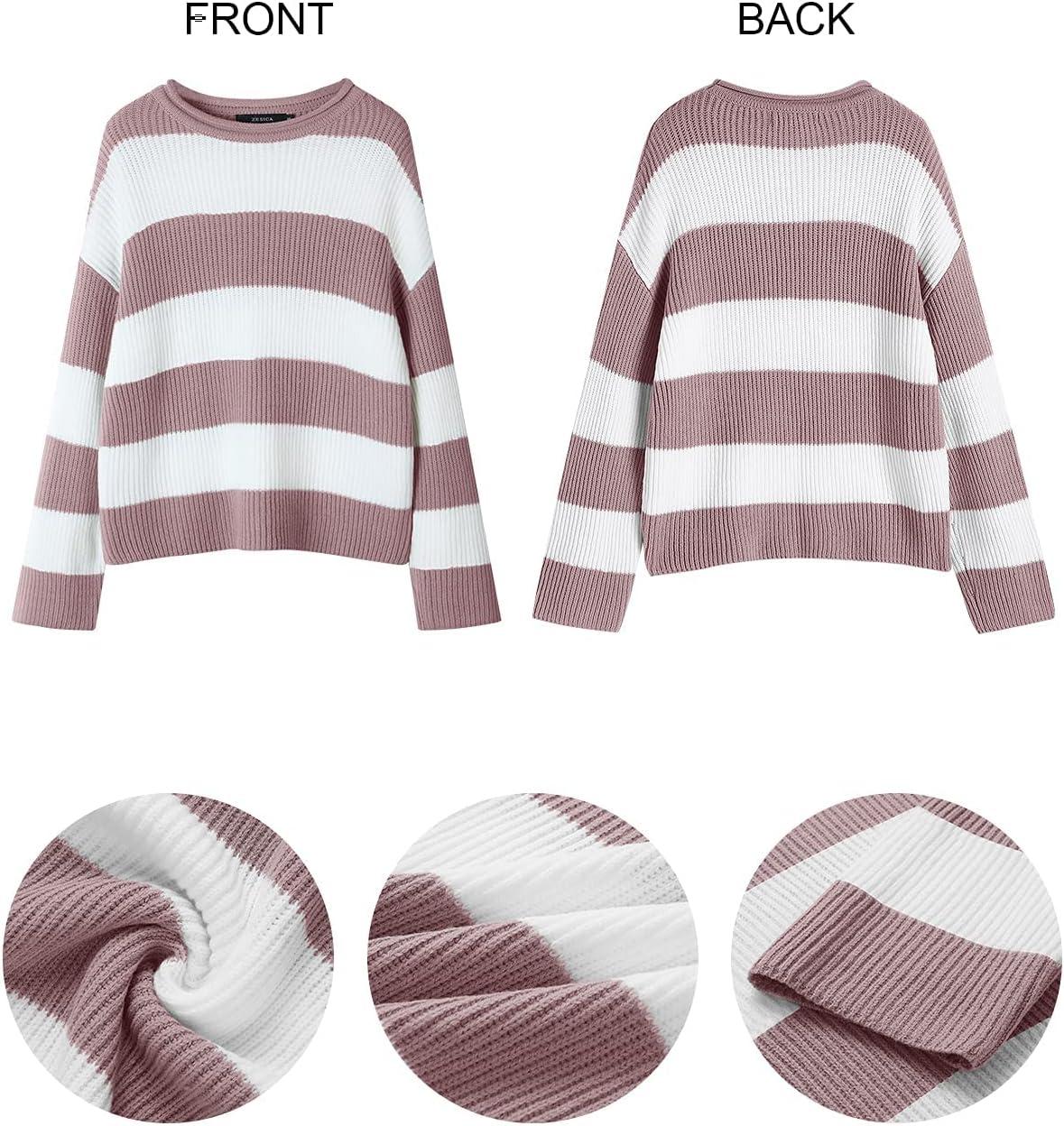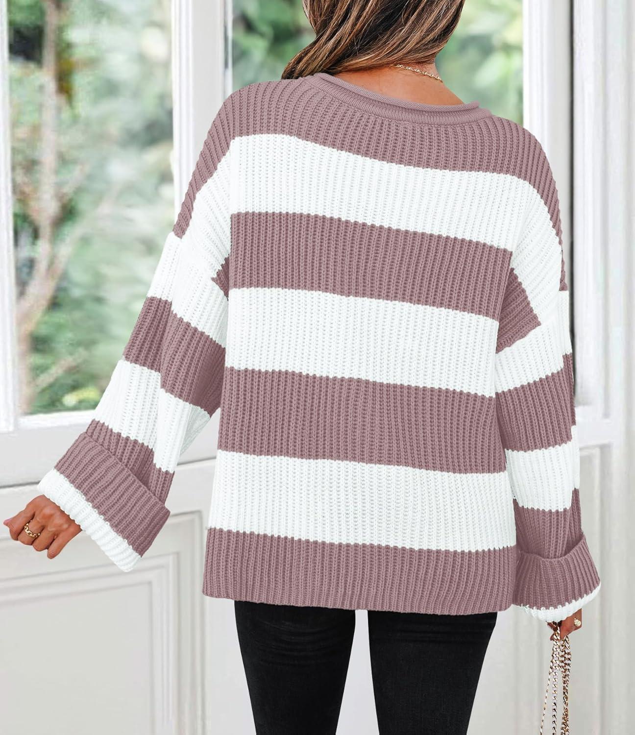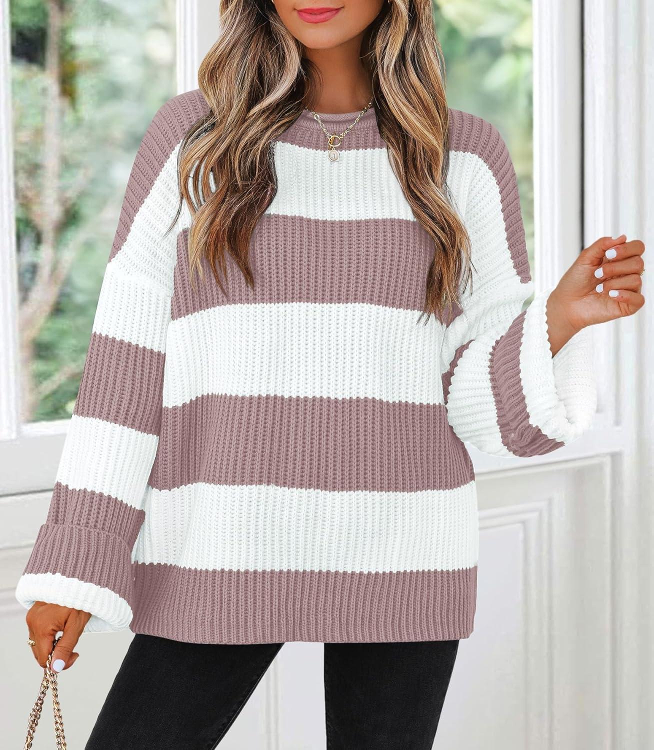 ZESICA Women’s 2025 Fall Long Sleeve Oversized Striped Color Block Comfy Loose Crew Neck Knitted Pullover Sweater(Pink)
