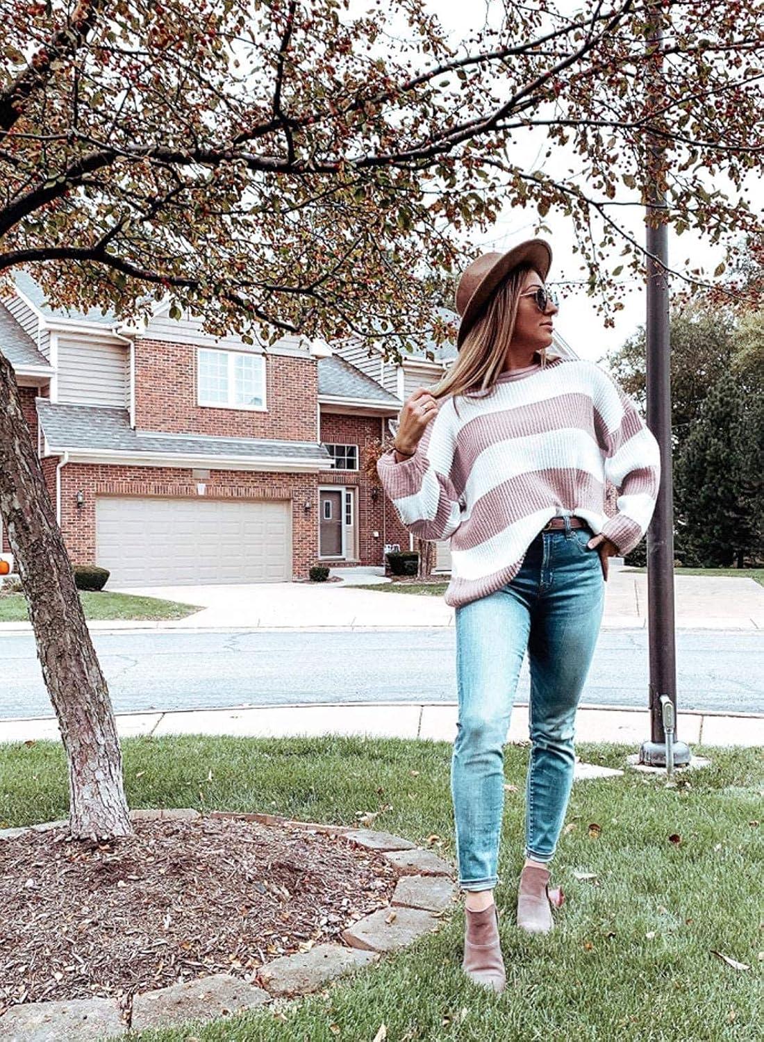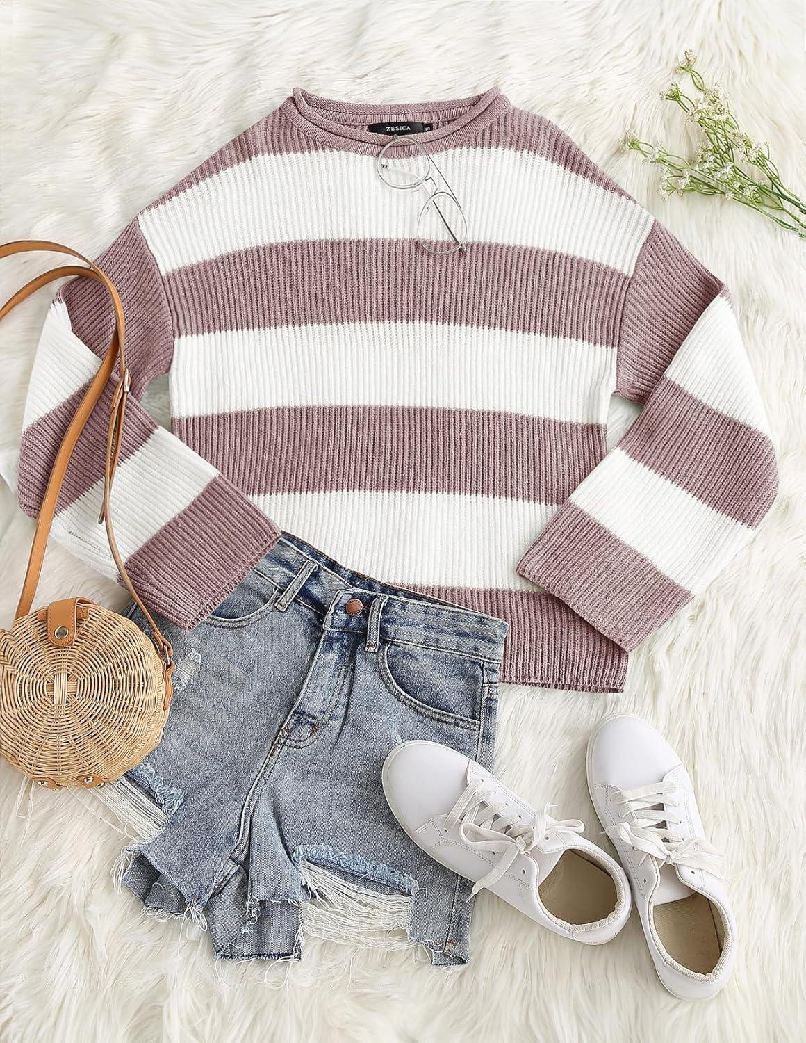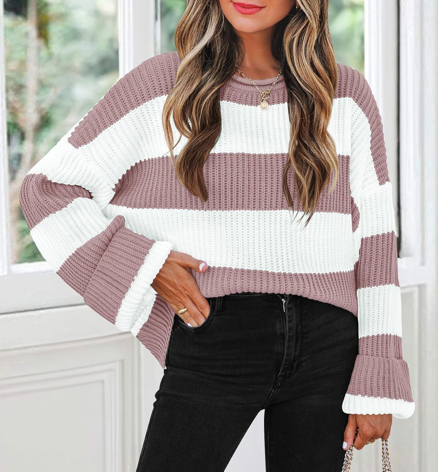 ZESICA Women’s 2025 Fall Long Sleeve Oversized Striped Color Block Comfy Loose Crew Neck Knitted Pullover Sweater(Pink)