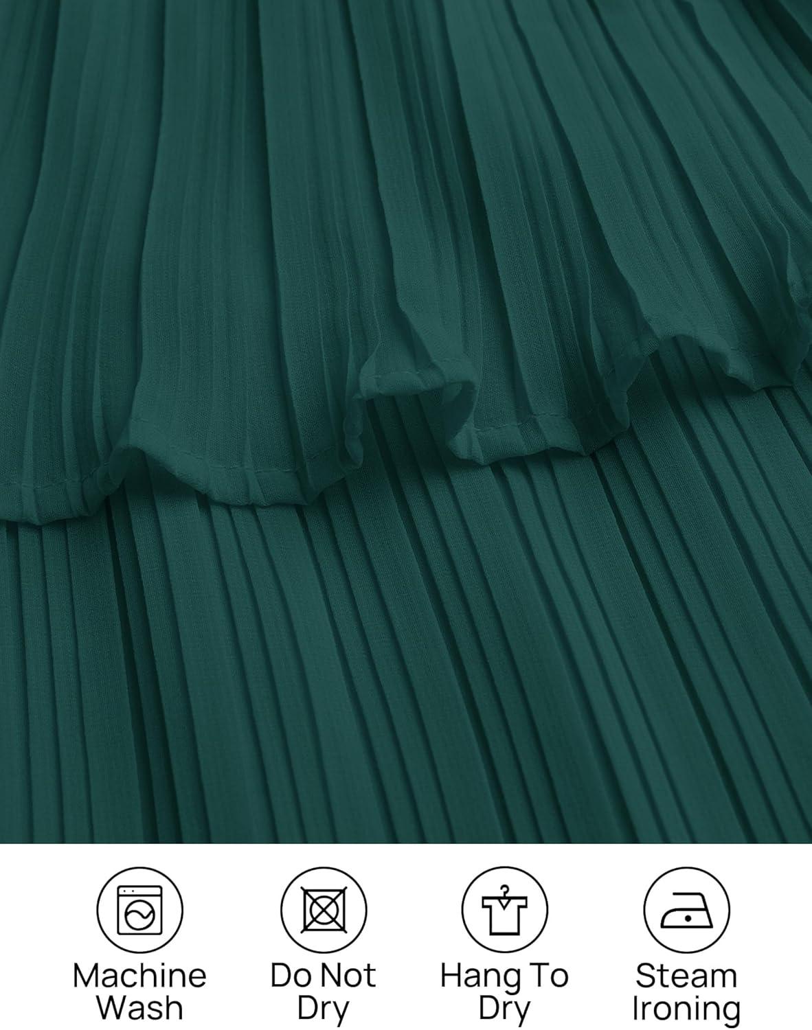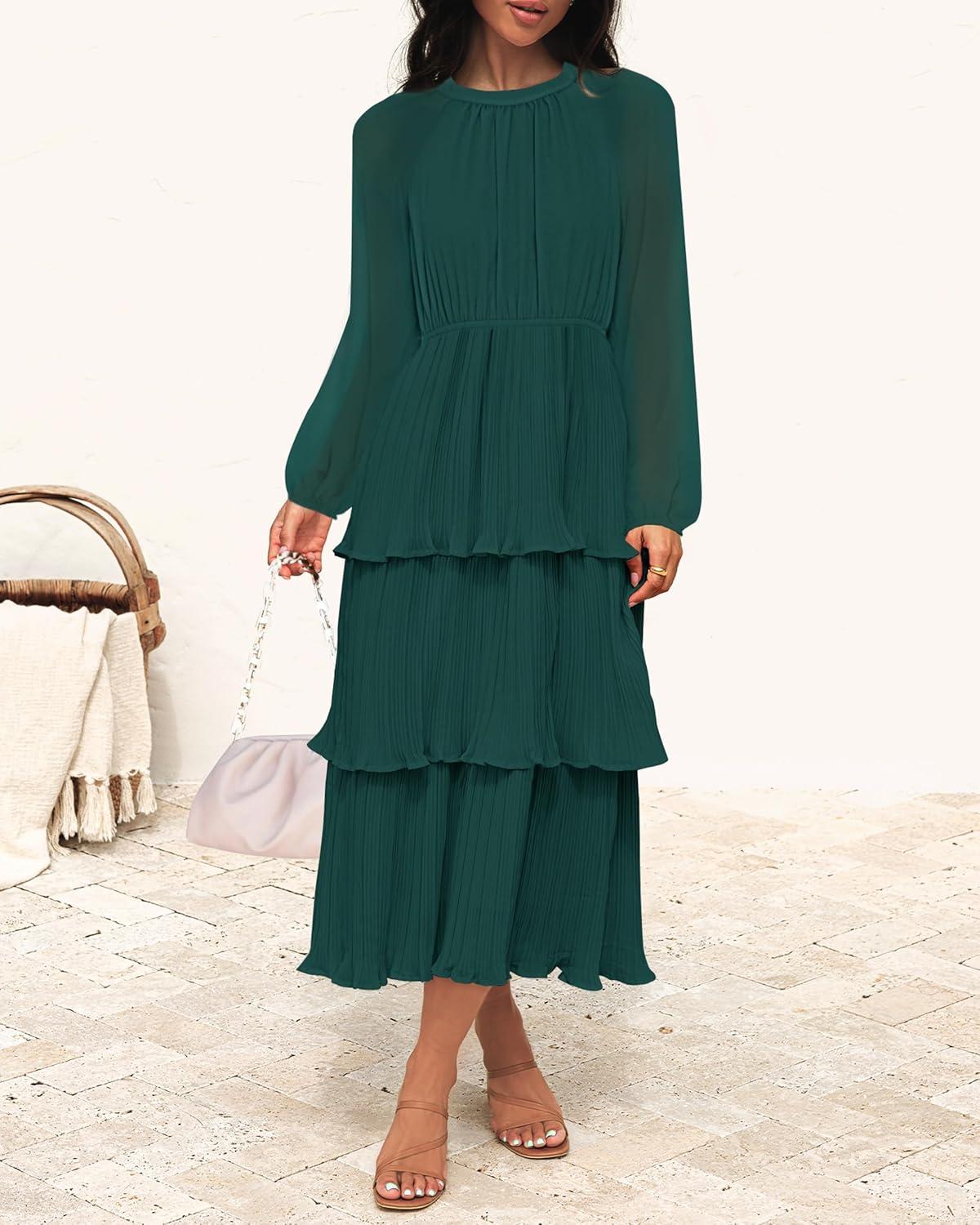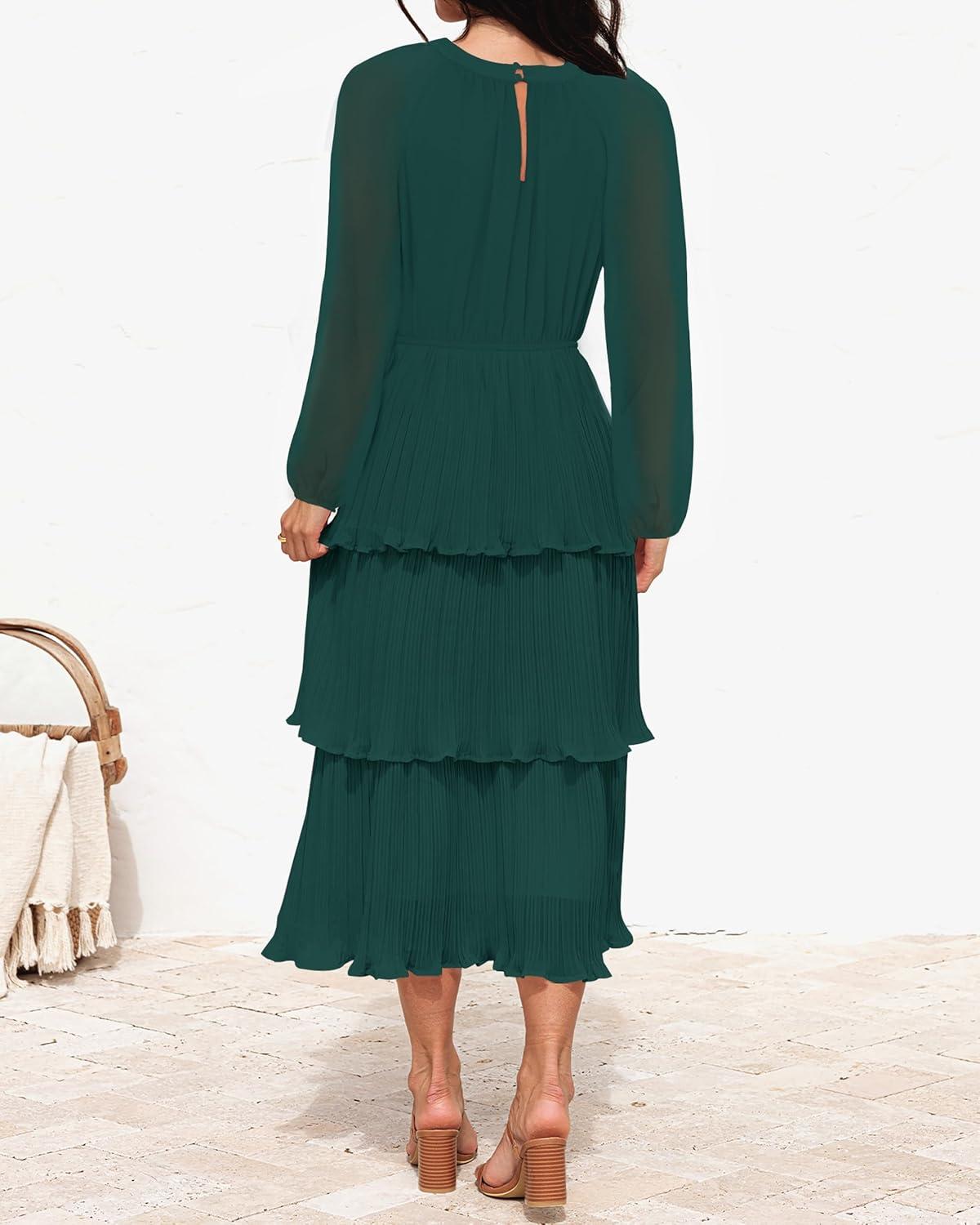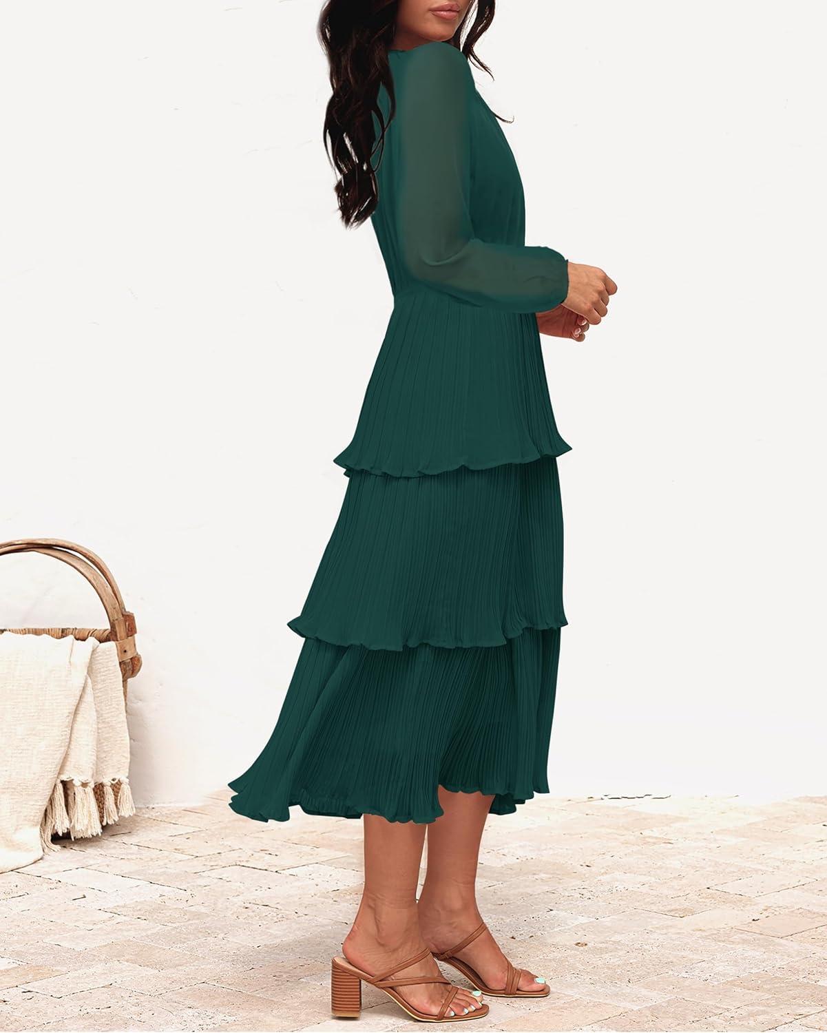 ZESICA Women's 2025 Fall Long Sleeve Ruffle Tiered Layered Chiffon Flowy Swing Wedding Guest Cocktail Party Midi Dress(Darkgreen)