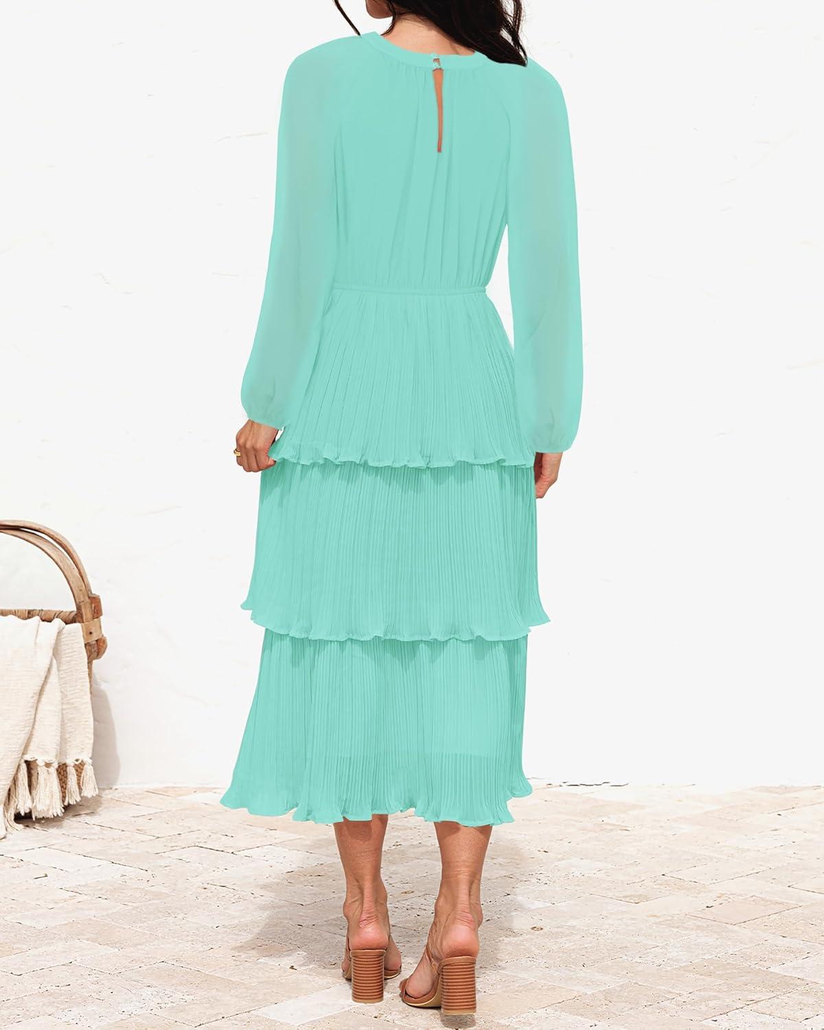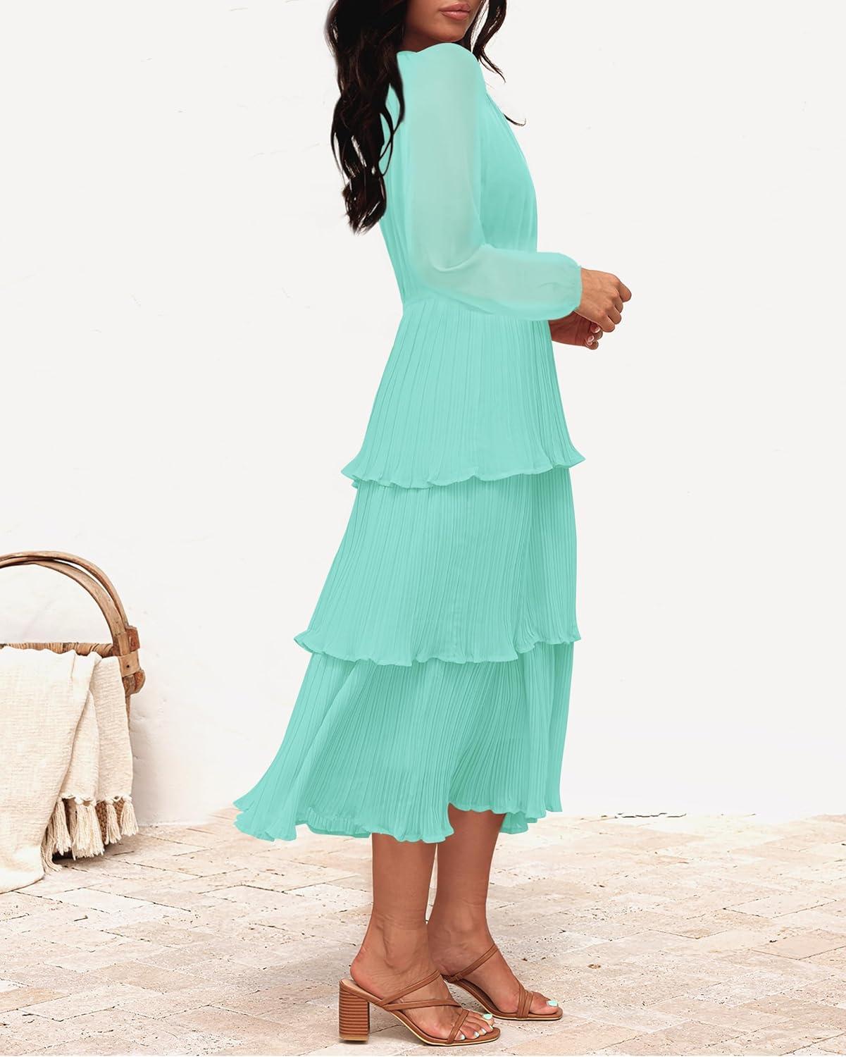 ZESICA Women's 2025 Fall Long Sleeve Ruffle Tiered Layered Chiffon Flowy Swing Wedding Guest Cocktail Party Midi Dress(Mint)