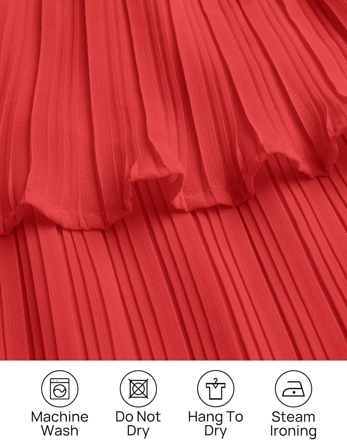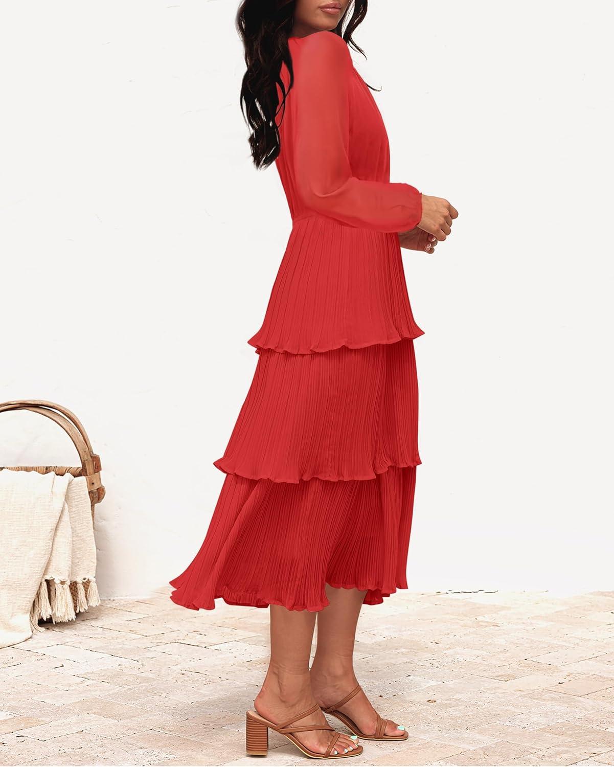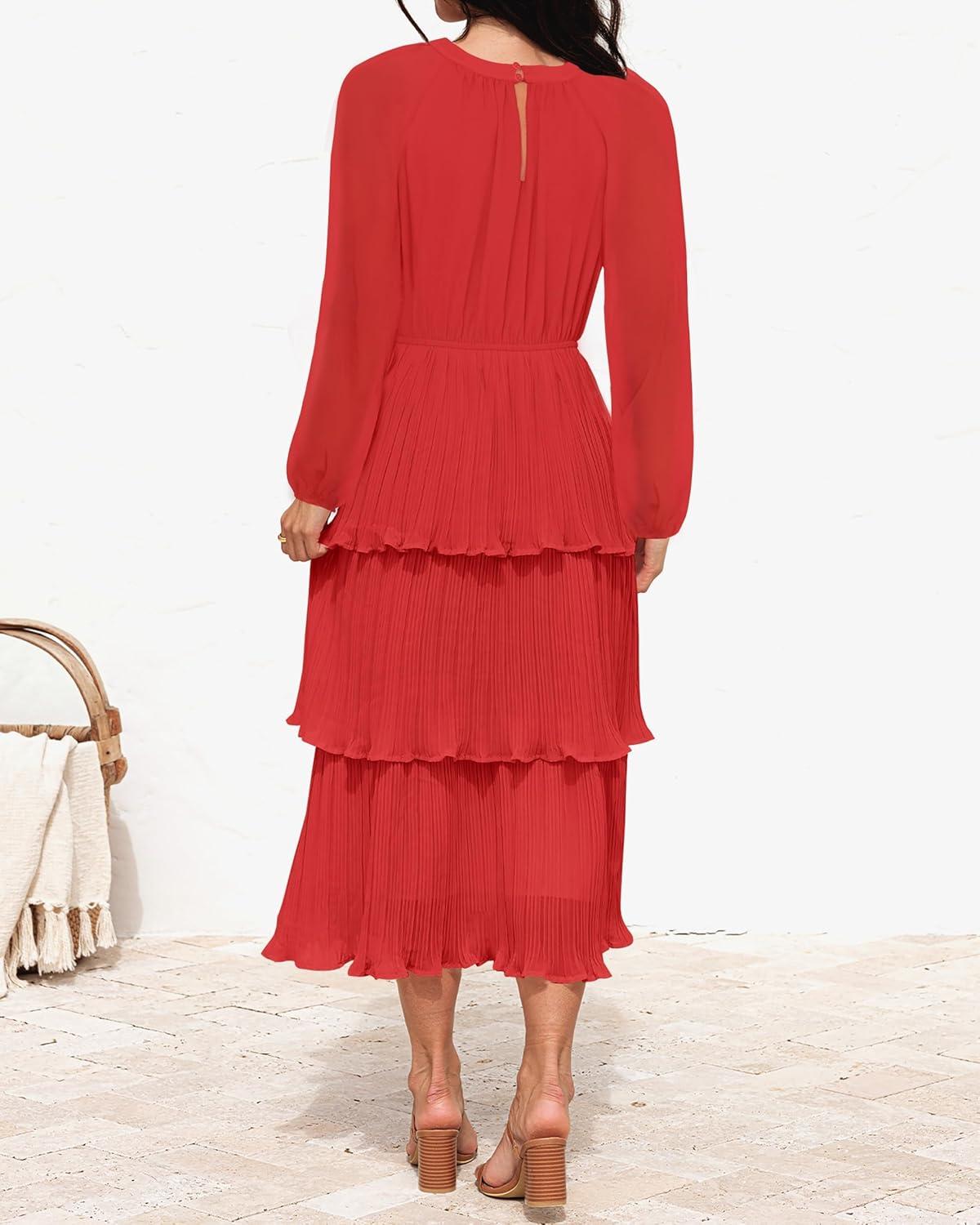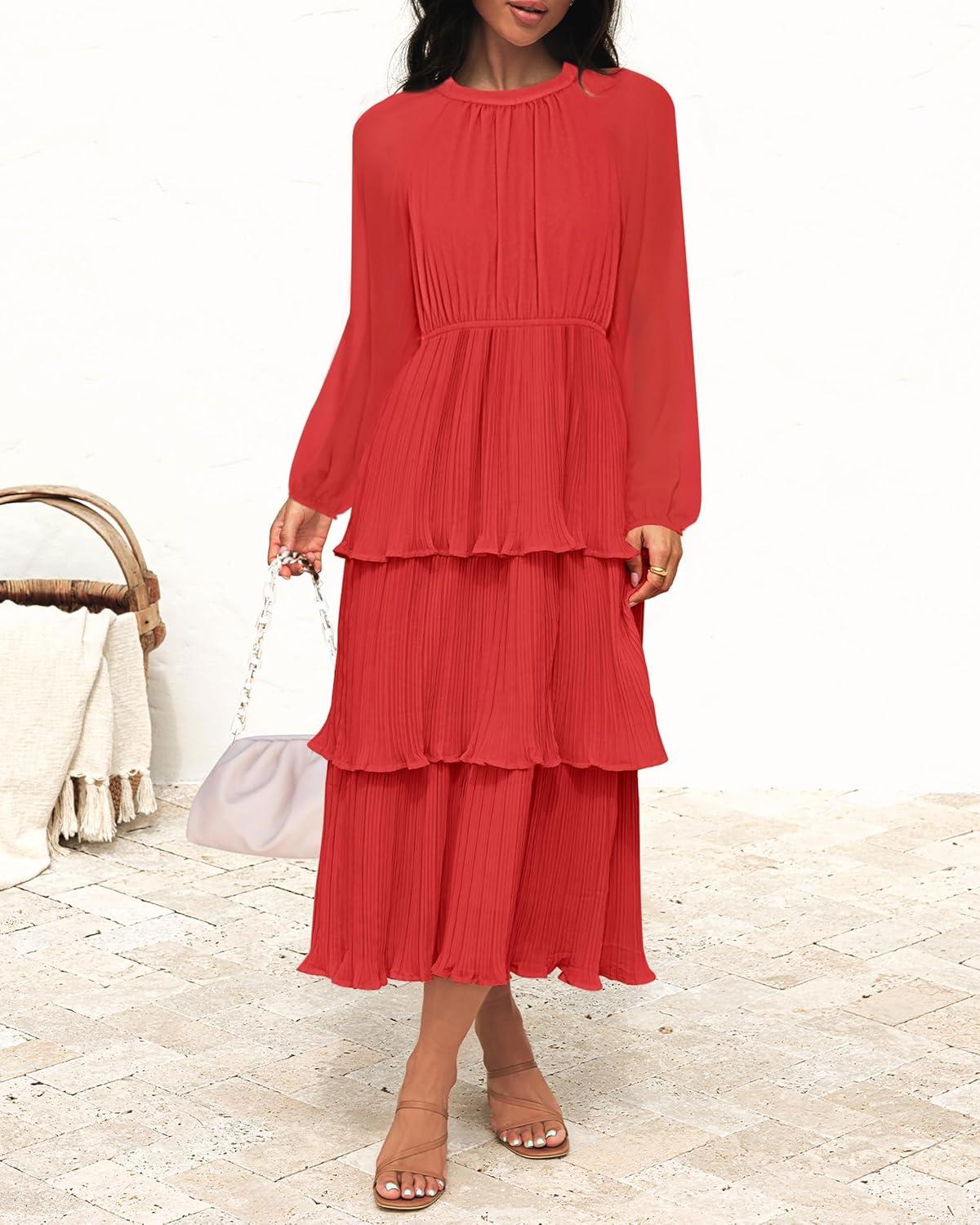 ZESICA Women's 2025 Fall Long Sleeve Ruffle Tiered Layered Chiffon Flowy Swing Wedding Guest Cocktail Party Midi Dress(Watermelon)