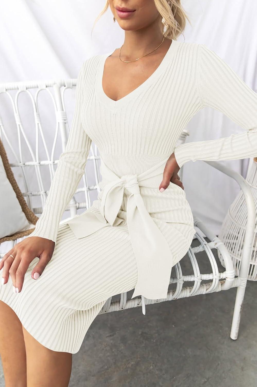 ZESICA Women’s 2025 Fall Sweater Dress V Neck Long Sleeve Ribbed Knit Tie Waist Bodycon Slim Fit Midi Dresses(White)