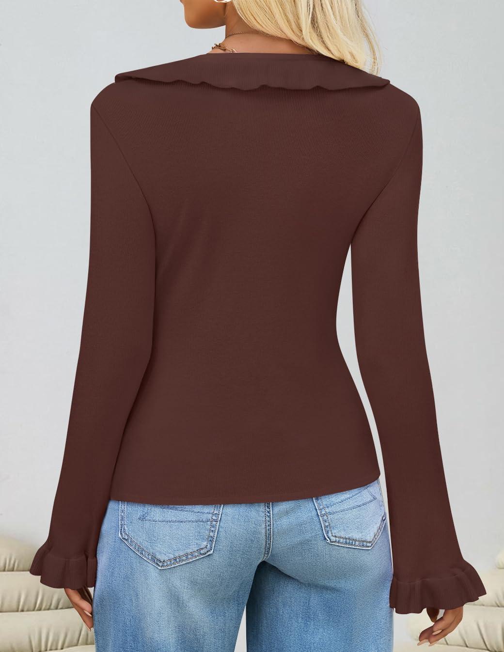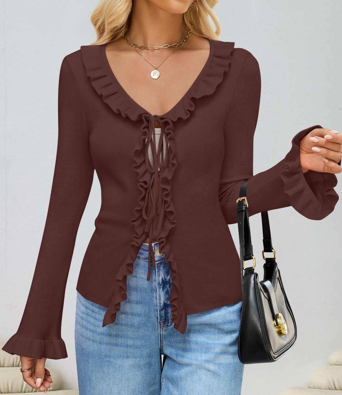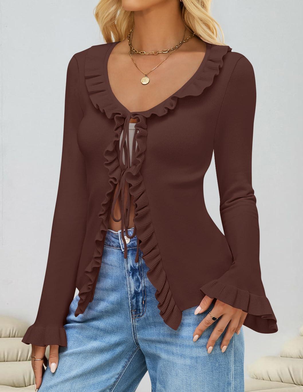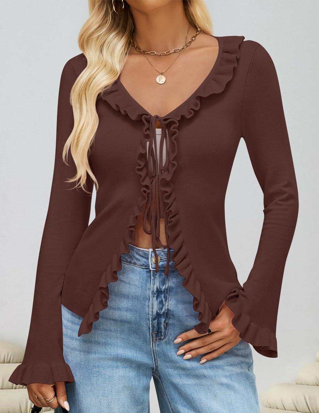 ZESICA Womens 2025 Fall Tie Front Bow Cardigan Sweaters Long Bell Sleeve V Neck Ruffled Knit Cropped Trendy Tops(Brown)