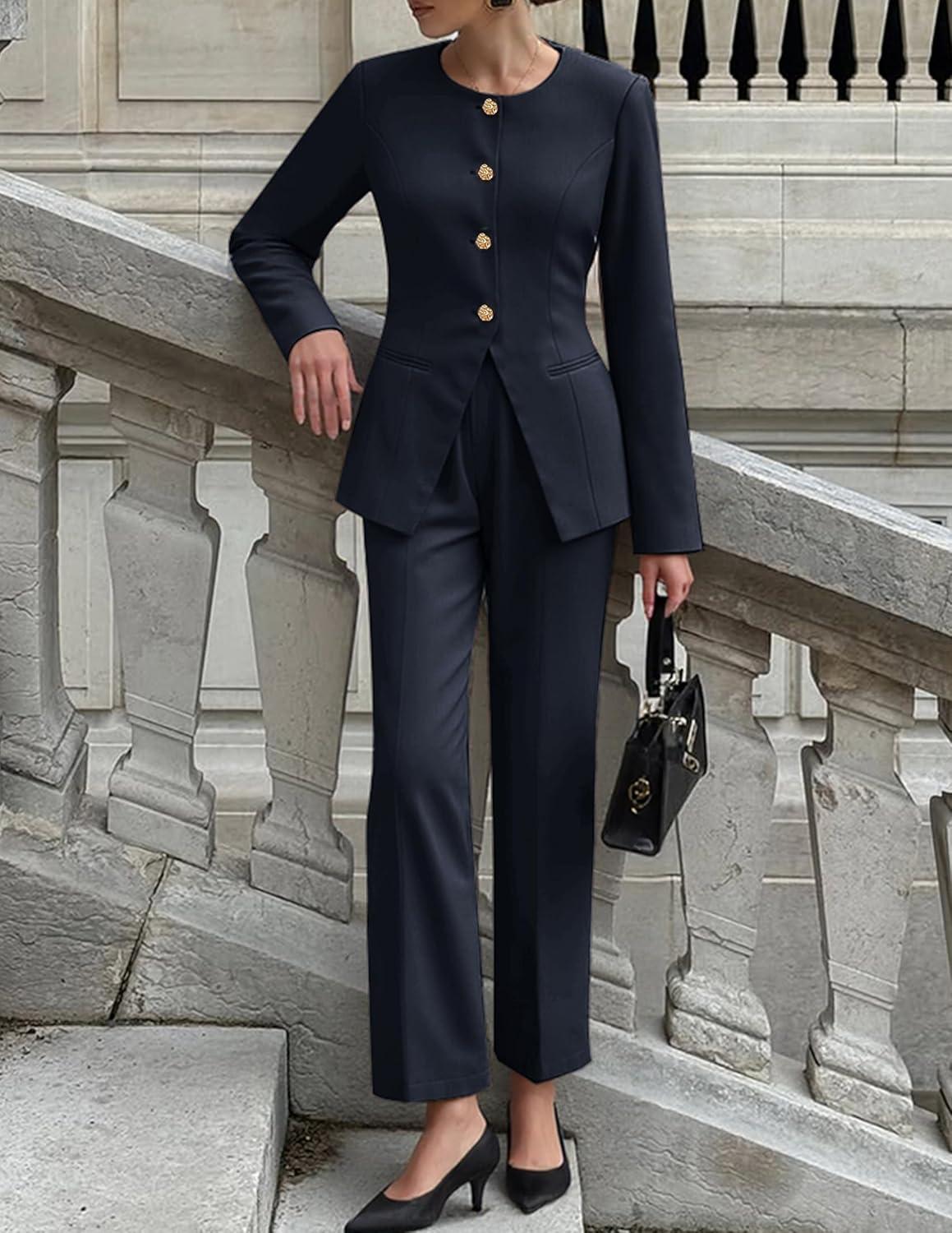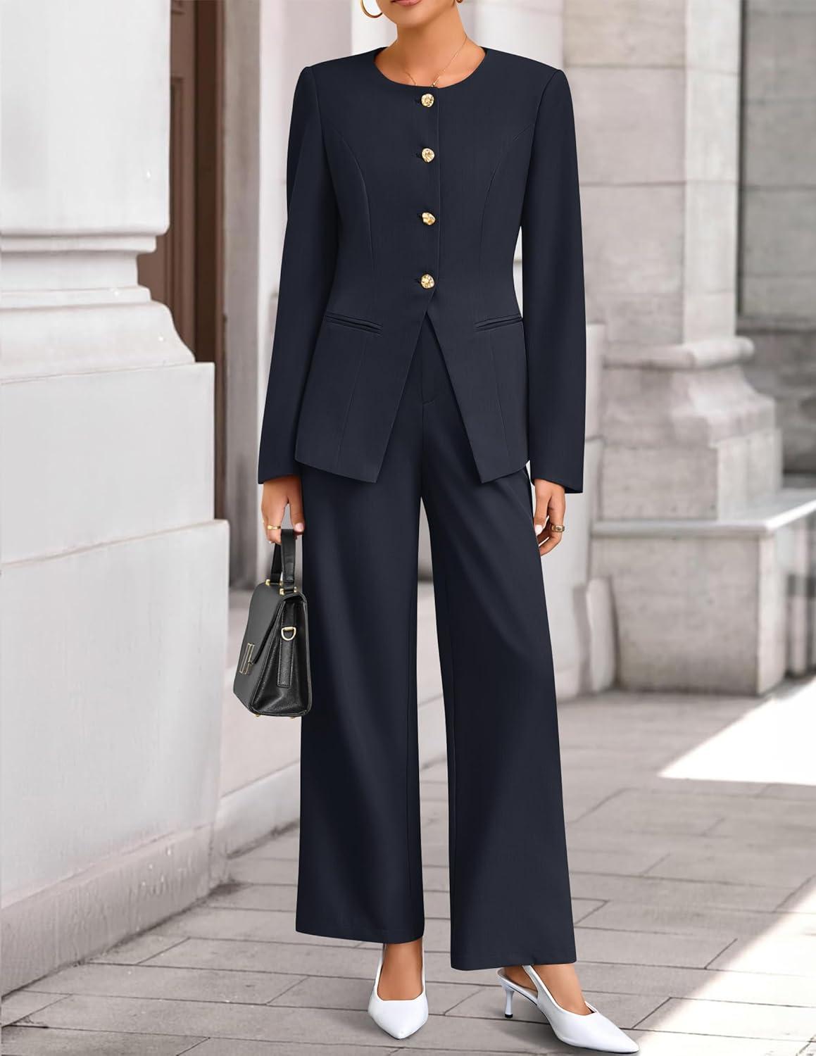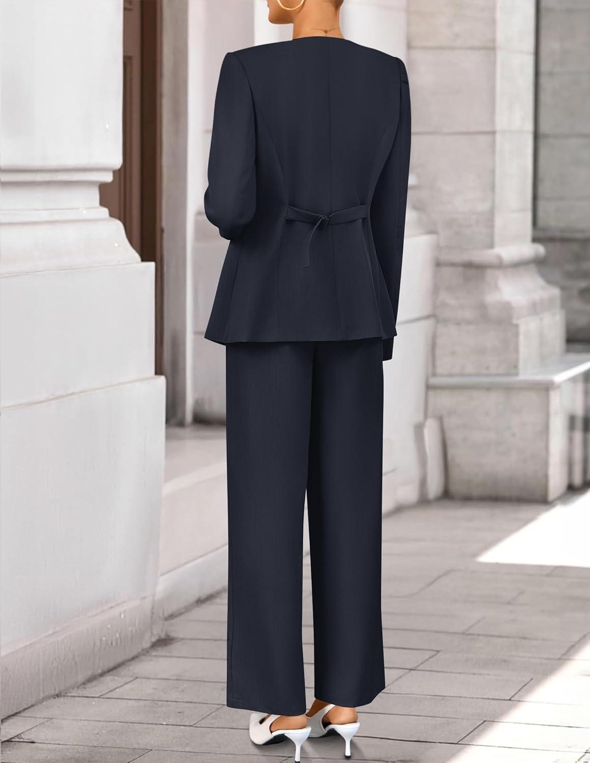 imageZESICA Womens 2025 Fall Two Piece Suits Set Casual Business Long Sleeve Blazer Jacket Wide Leg Pants Work Outfits SetsNavy