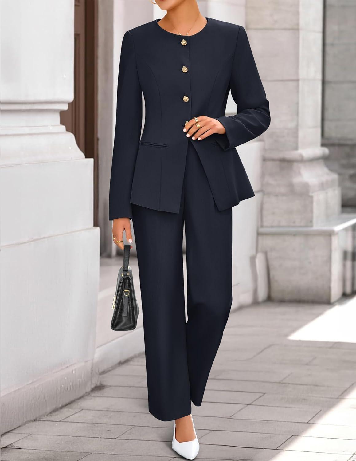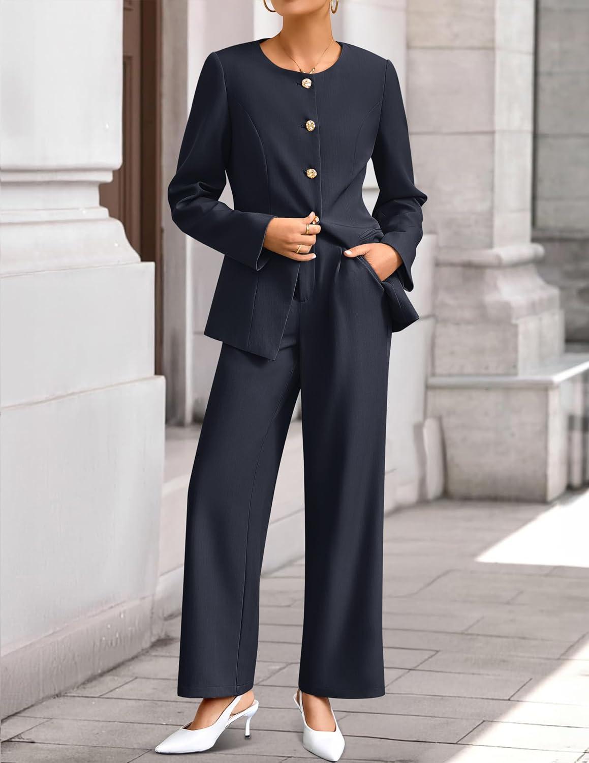ZESICA Women’s 2025 Fall Two Piece Suits Set Casual Business Long Sleeve Blazer Jacket Wide Leg Pants Work Outfits Sets(Navy)