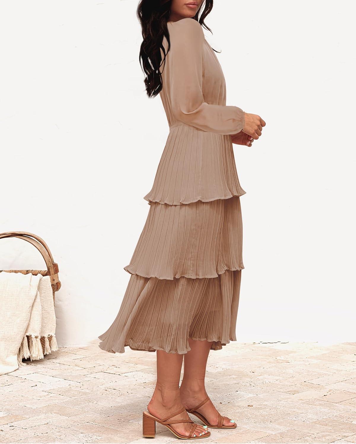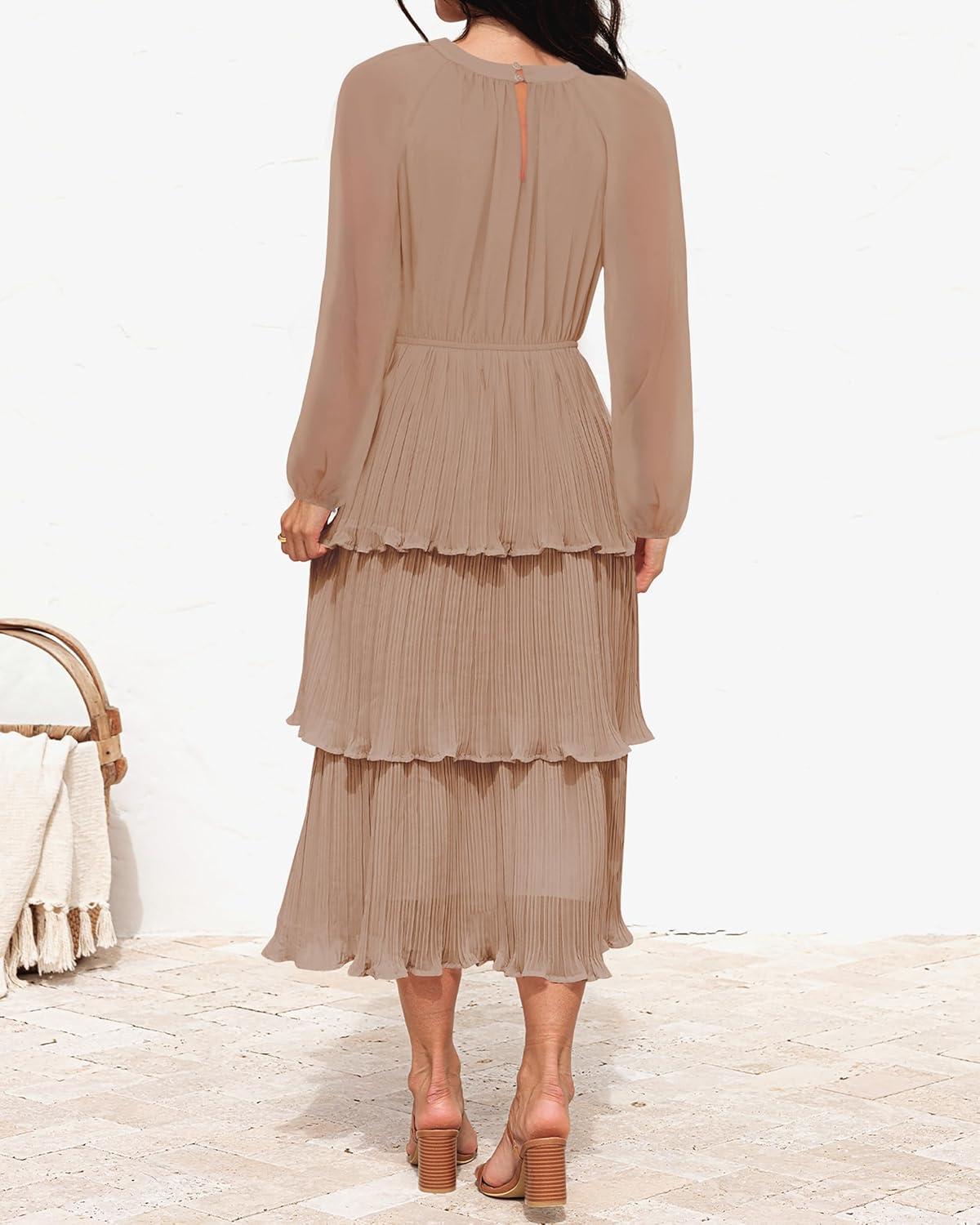 ZESICA Women’s 2025 Long Sleeve Crew Neck Ruffle Tiered Layered Chiffon Flowy Swing Long Midi Dress(Khaki)