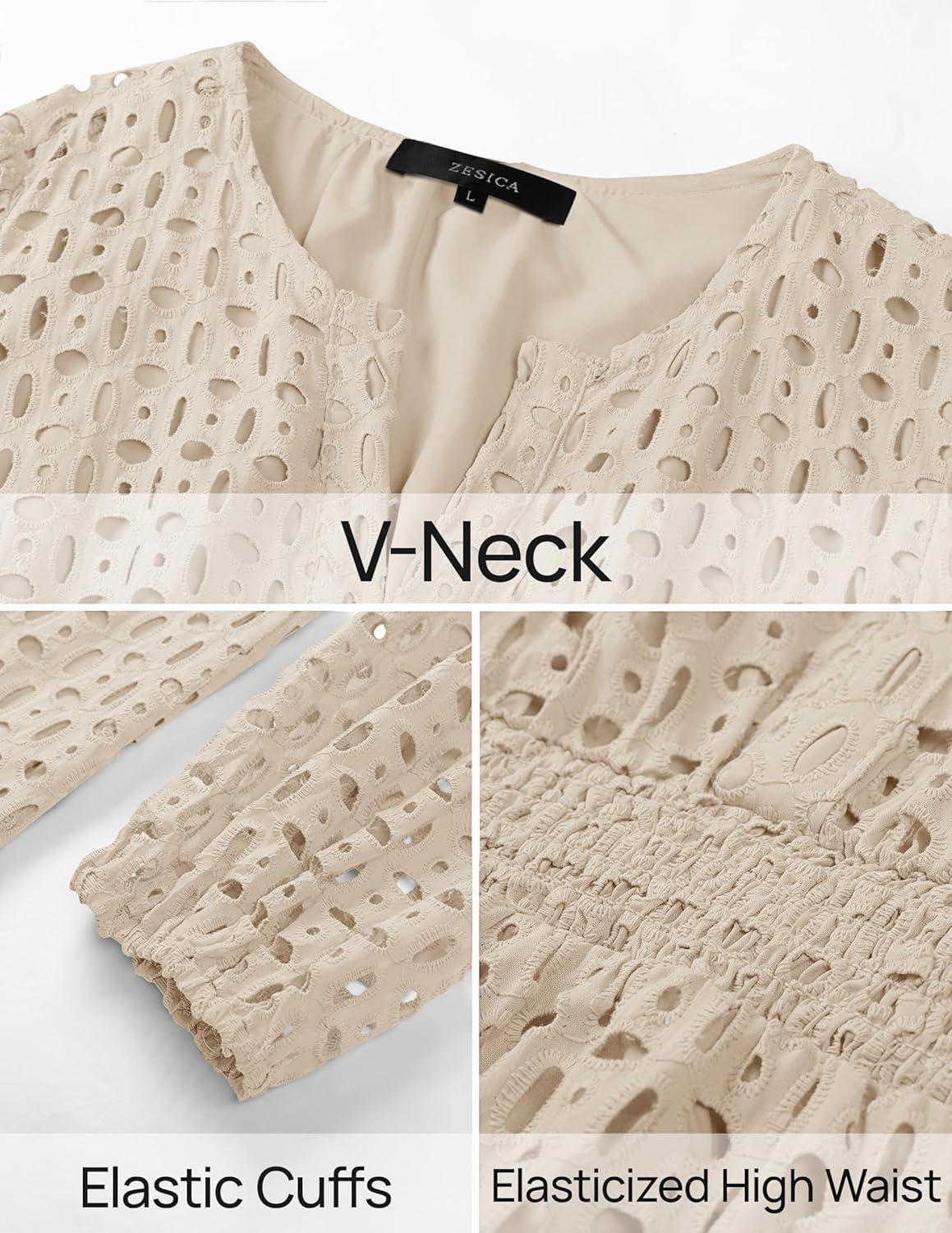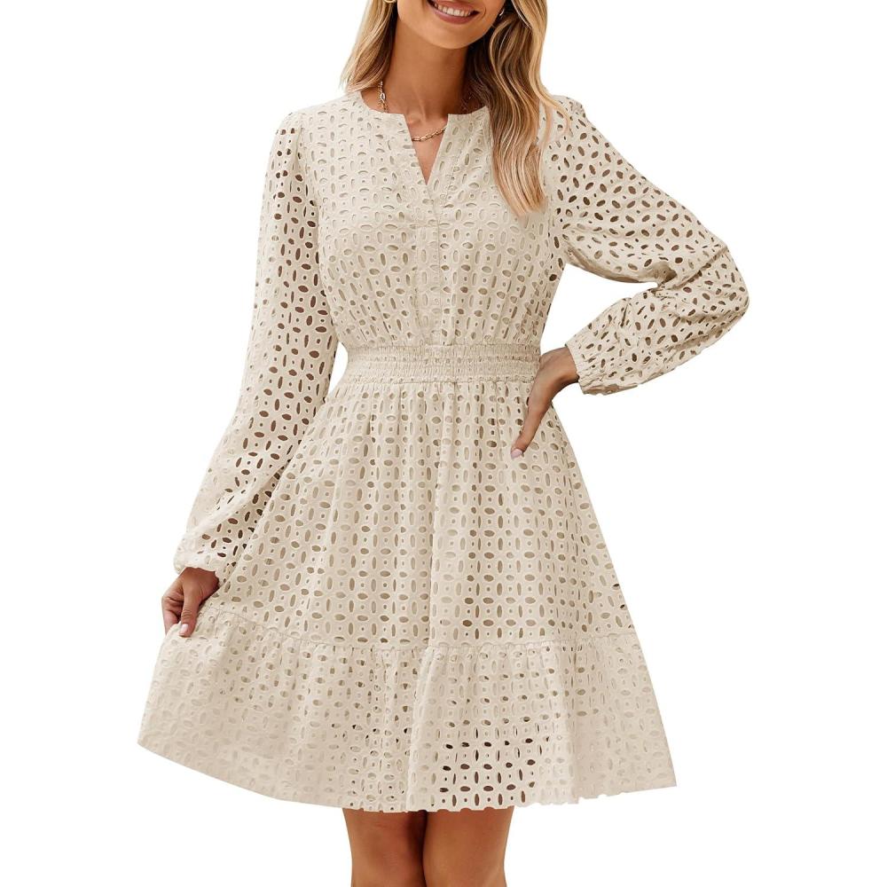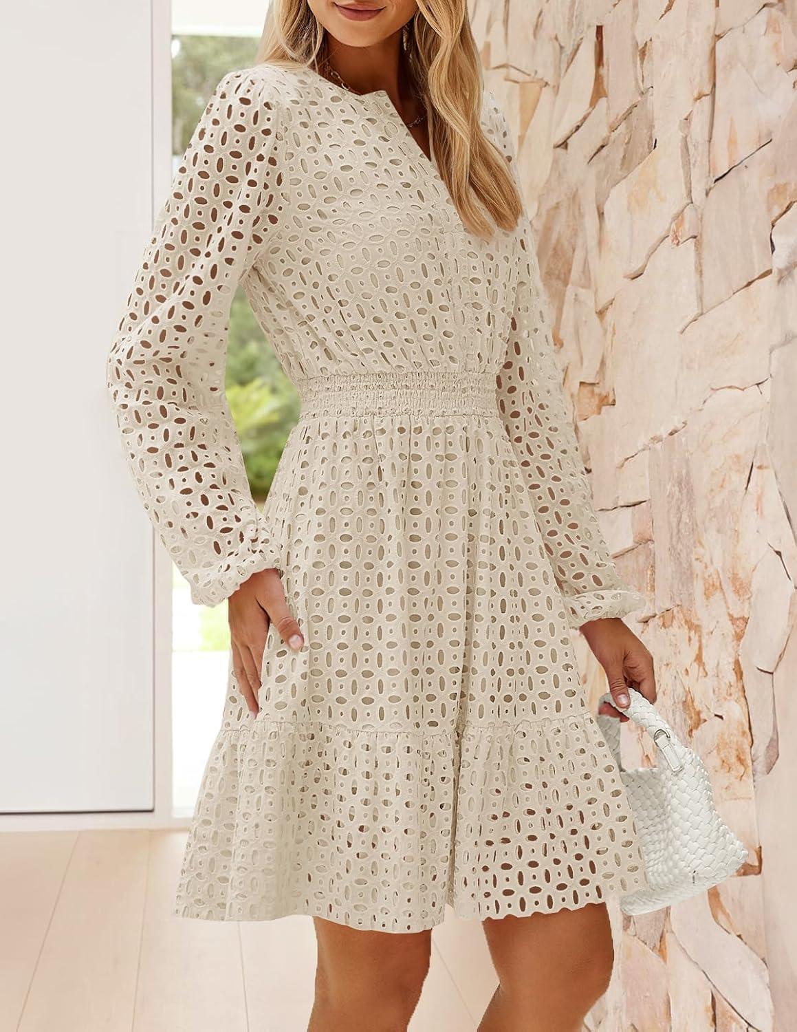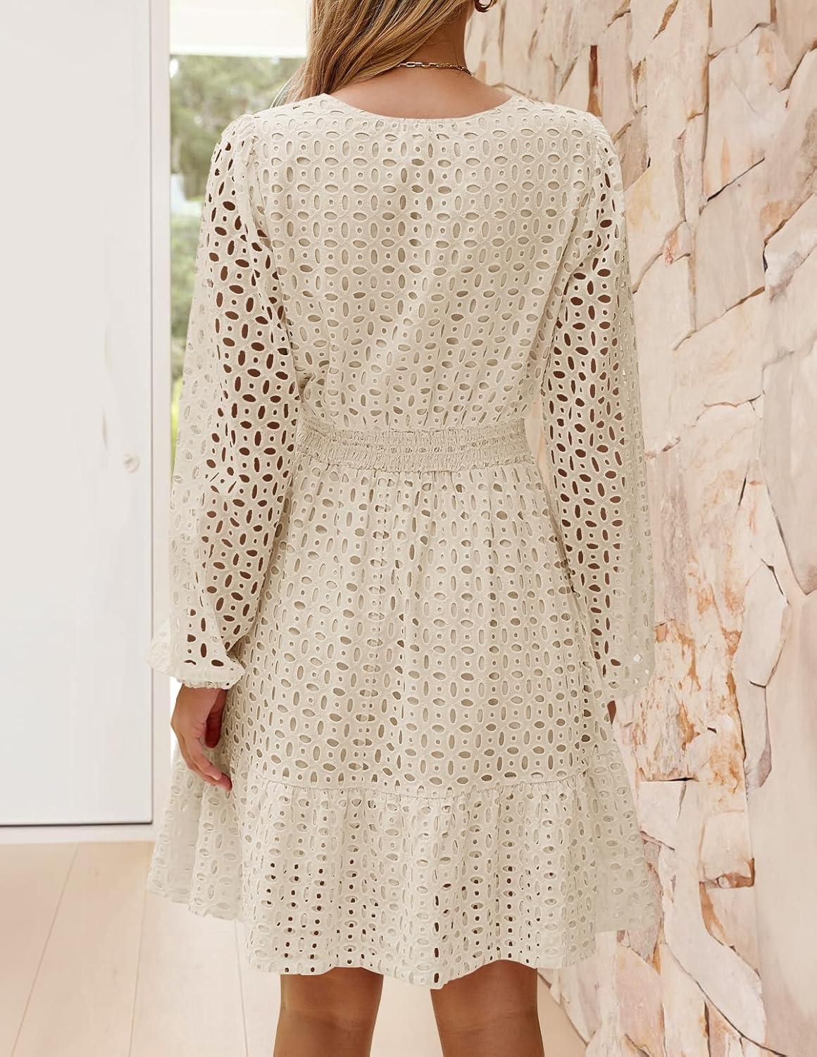 ZESICA Women's 2025 Long Sleeve Mini Dress Fall V Neck Hollow Out Eyelet Embroidery Ruffle A Line Swing Short Dresses(Apricot)