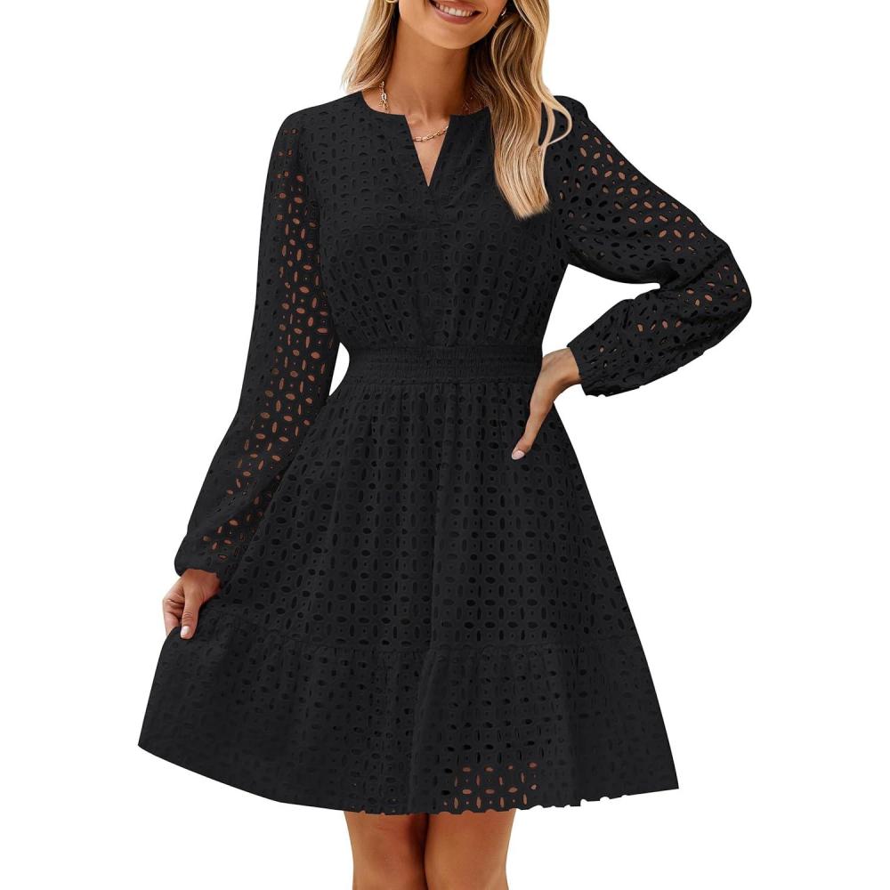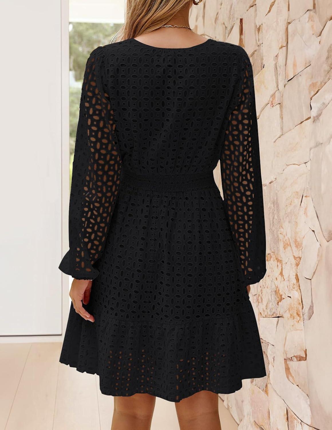 ZESICA Women's 2025 Long Sleeve Mini Dress Fall V Neck Hollow Out Eyelet Embroidery Ruffle A Line Swing Short Dresses(Black)