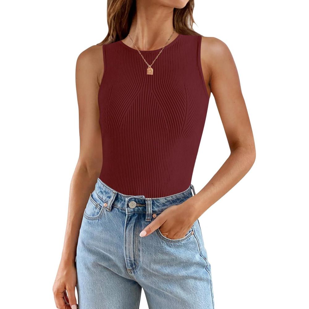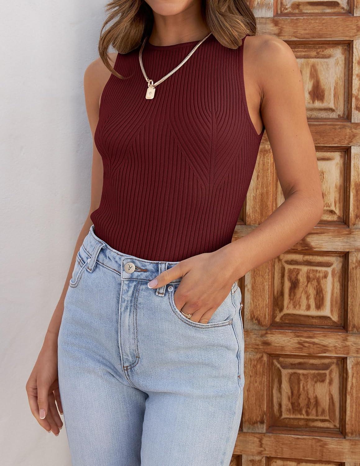 imageZESICA Womens 2025 Ribbed Tank Tops Summer Sleeveless High Neck Casual Slim Fitted Basic Knit ShirtsWine