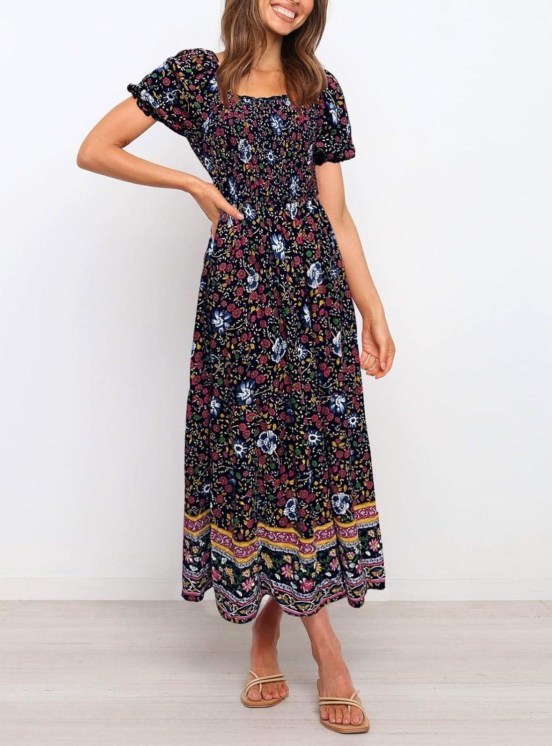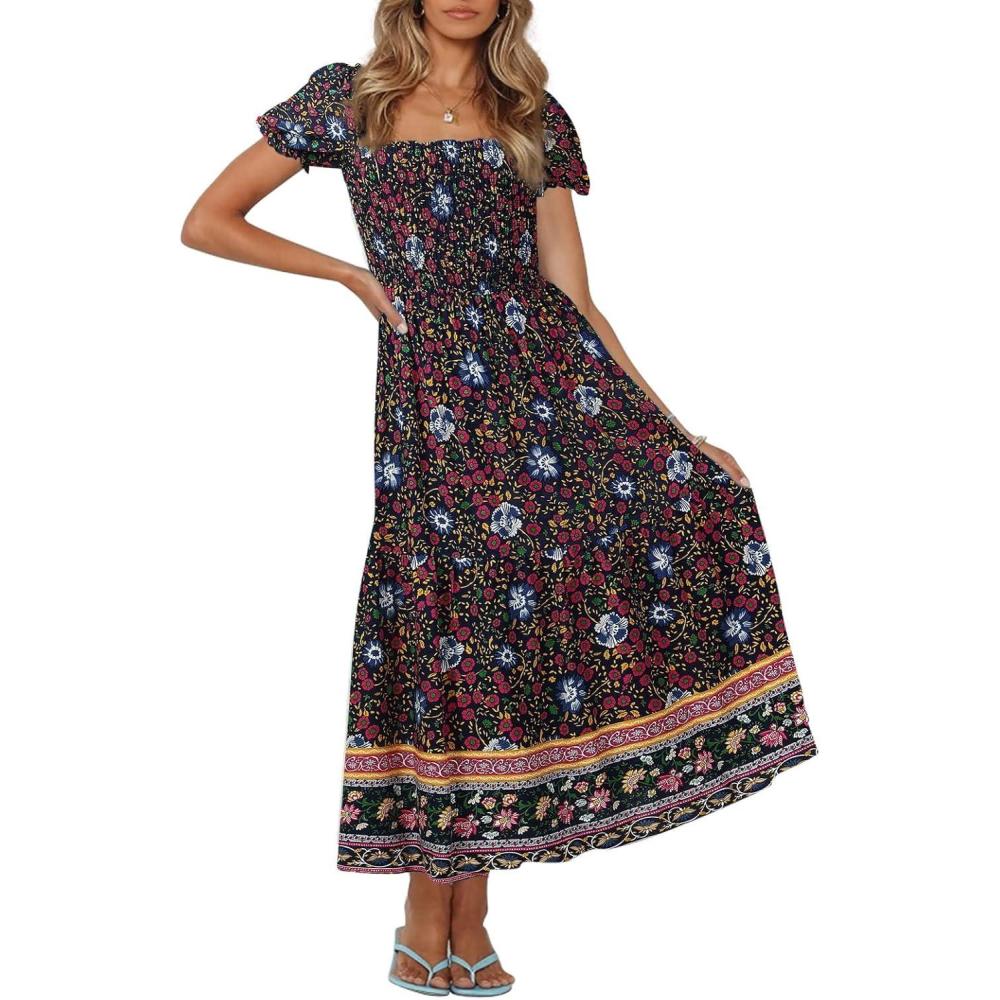 ZESICA Women’s 2025 Summer Boho Floral Print Square Neck Ruffle Swing Beach Long Maxi Dress(Navy)