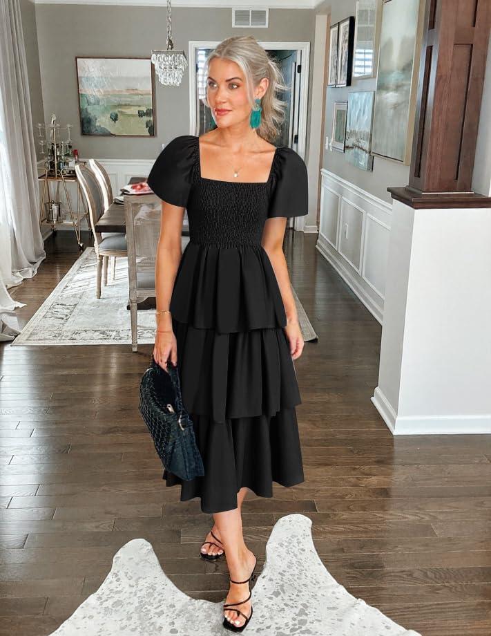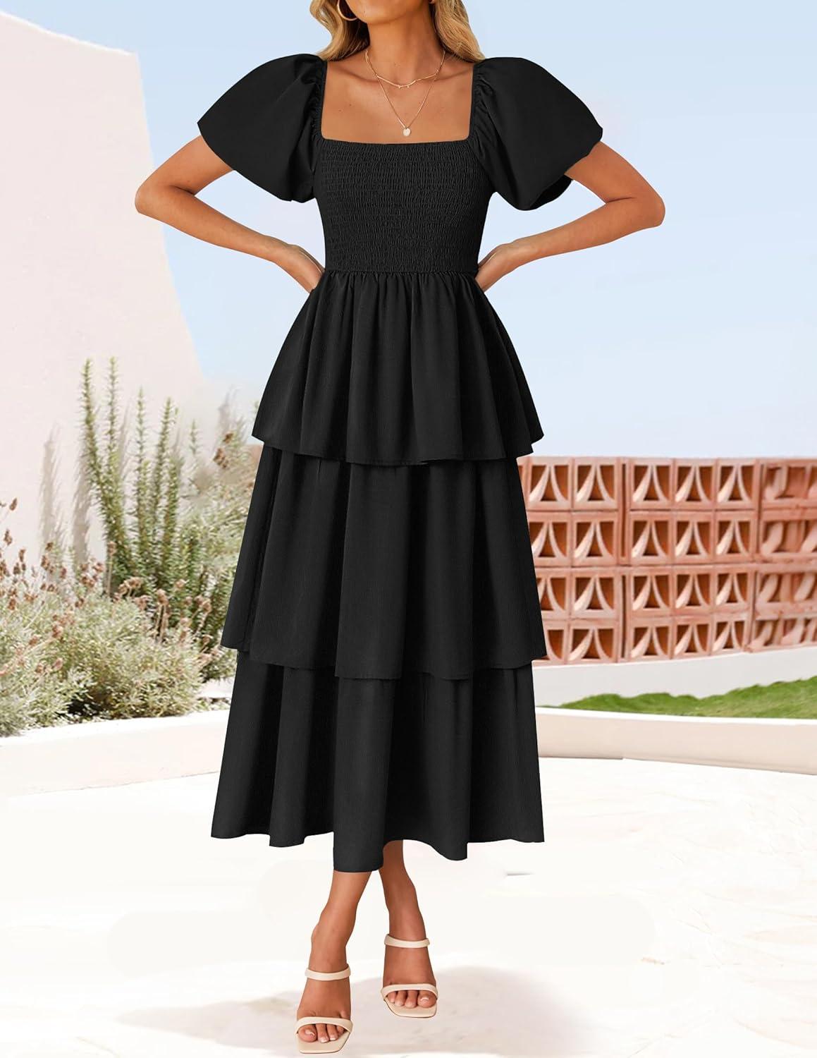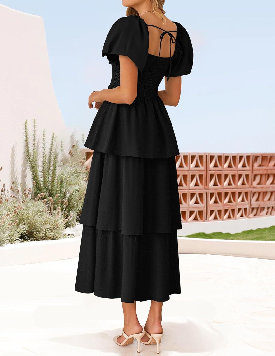 ZESICA Women’s 2025 Summer Boho Midi Dress Short Puff Sleeve Flowy A Line Tiered Beach Vacation Long Dresses(Black)