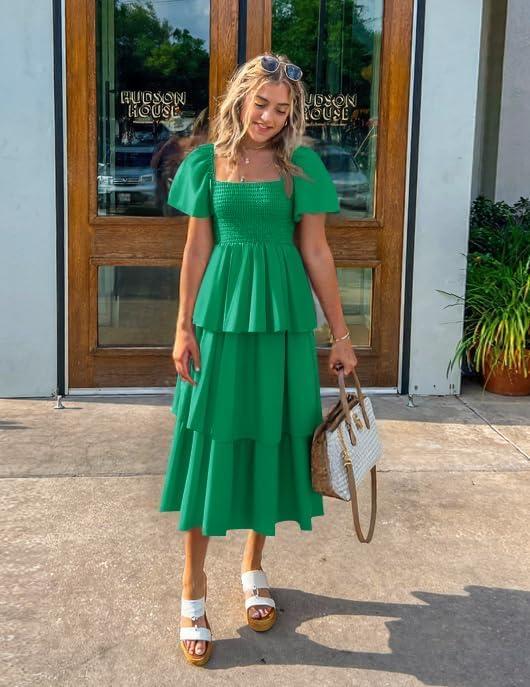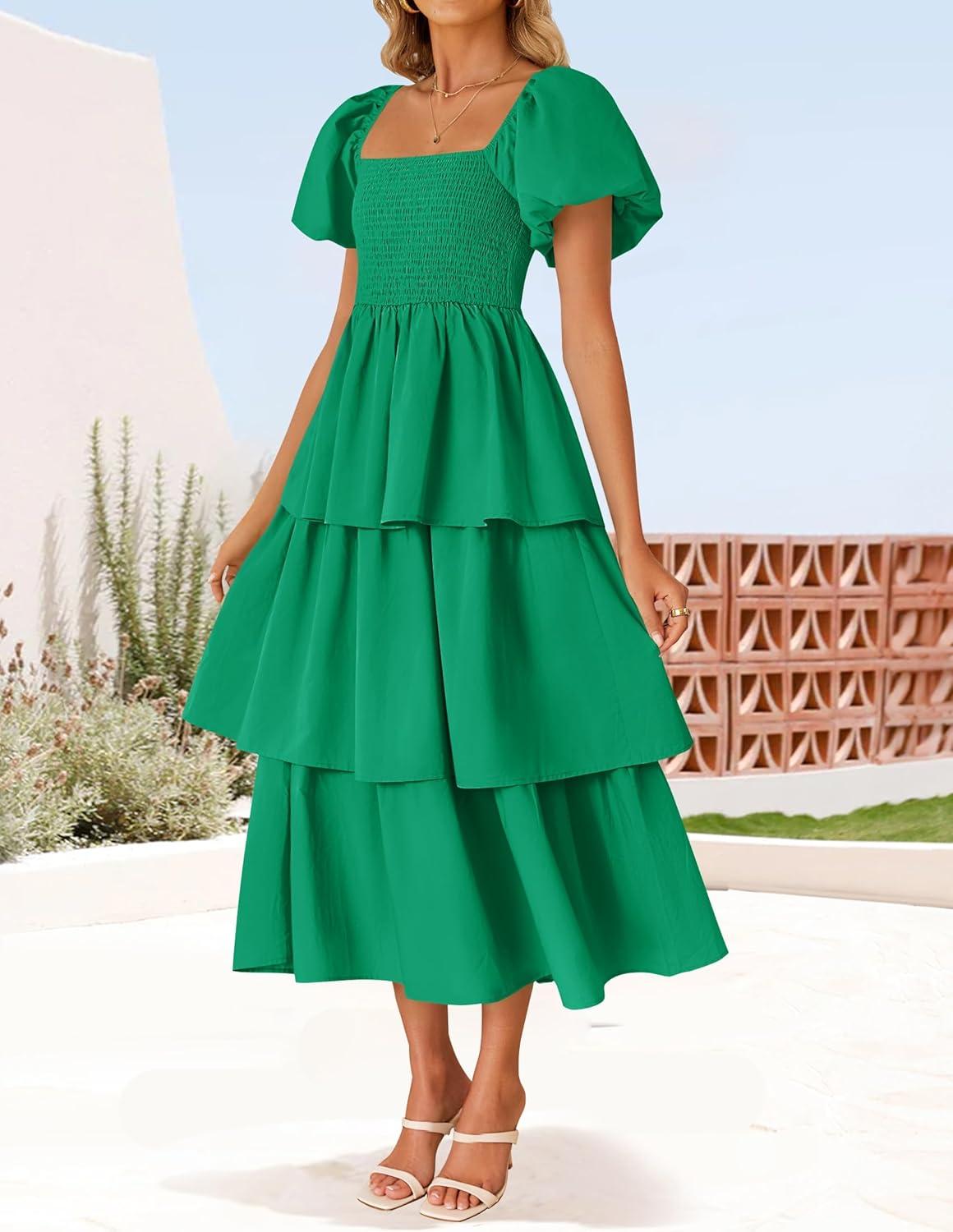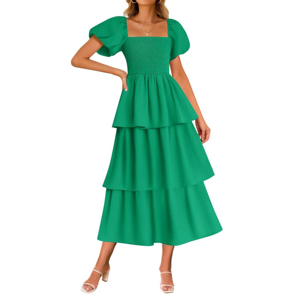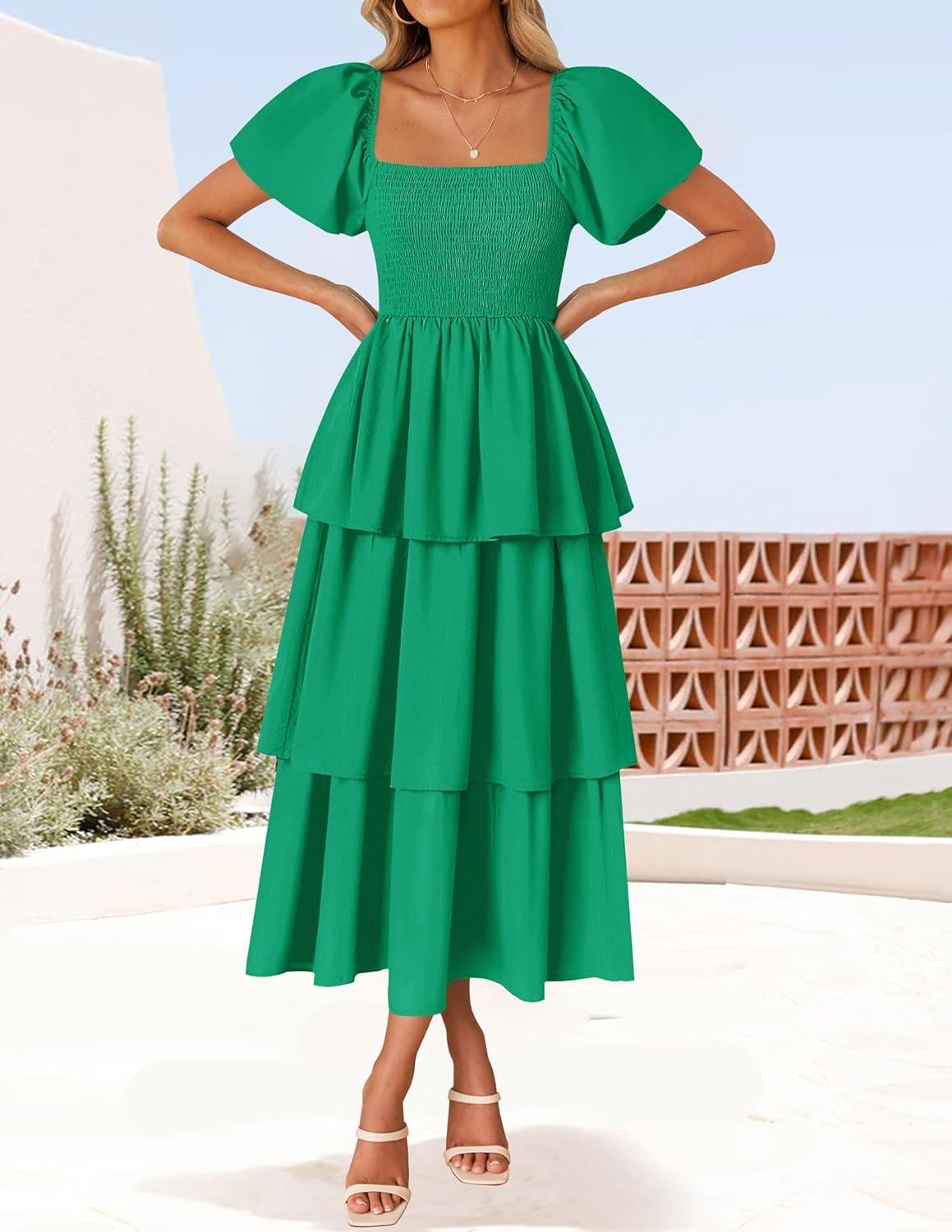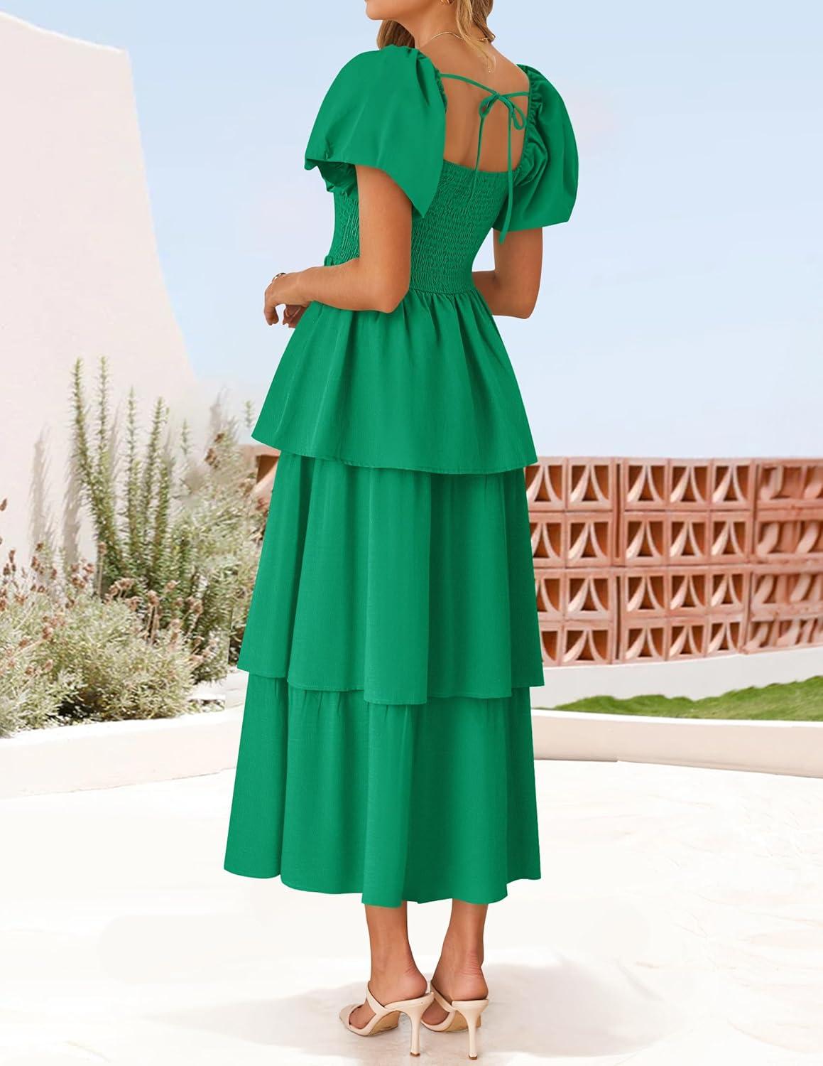ZESICA Women’s 2025 Summer Boho Midi Dress Short Puff Sleeve Flowy A Line Tiered Beach Vacation Long Dresses(Green)