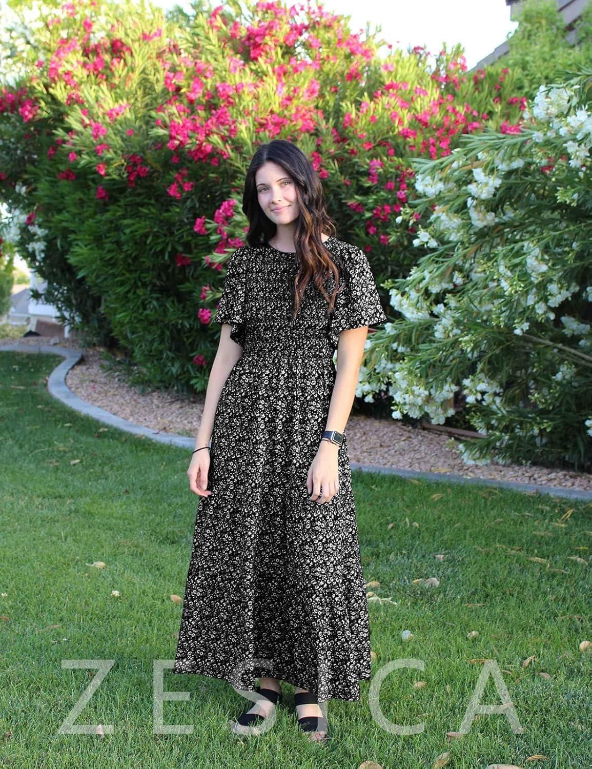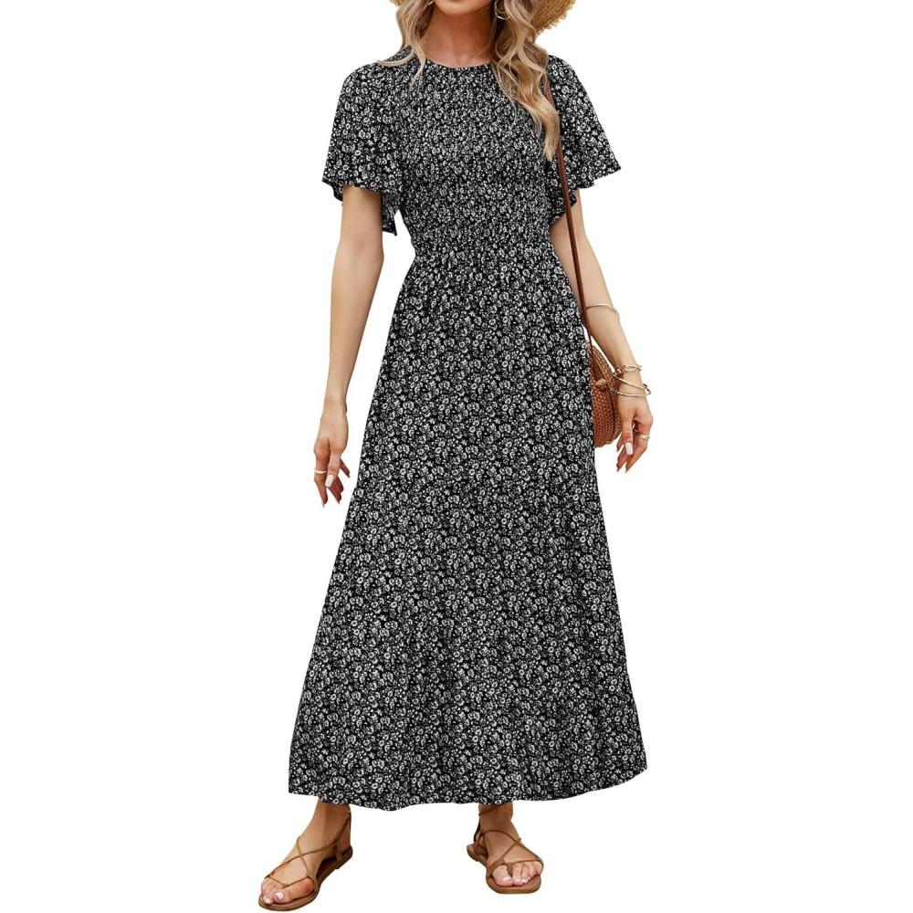 ZESICA Women's 2025 Summer Casual Floral Print Short Flutter Sleeve Crew Neck Smocked High Waist Flowy Maxi Dress(Black)