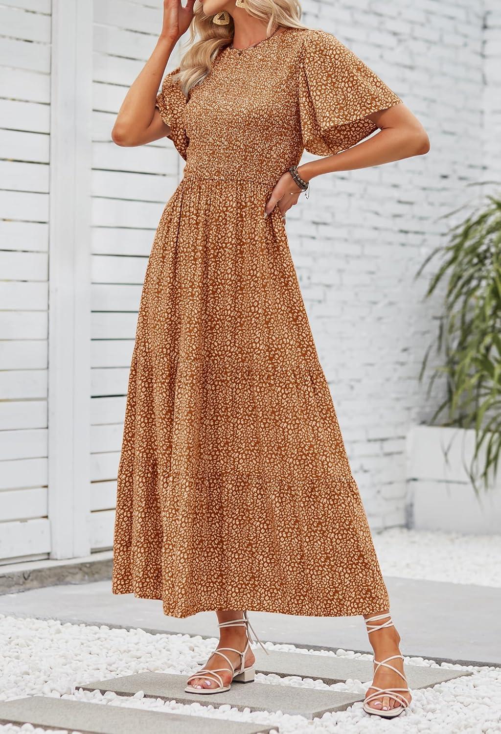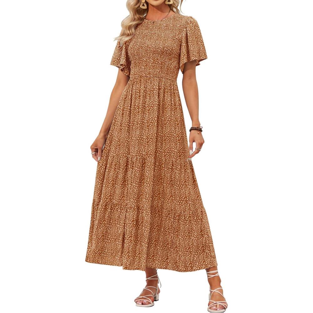 ZESICA Women’s 2025 Summer Casual Floral Print Short Flutter Sleeve Crew Neck Smocked High Waist Flowy Maxi Dress(Brown)