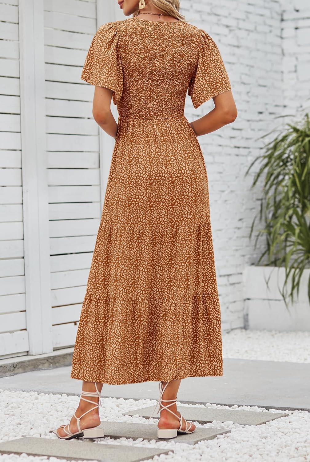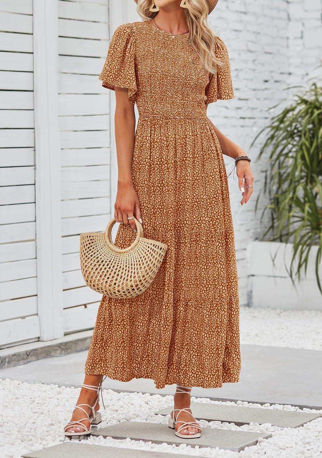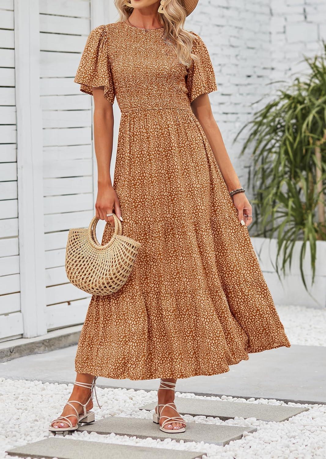ZESICA Women's 2025 Summer Casual Floral Print Short Flutter Sleeve Crew Neck Smocked High Waist Flowy Maxi Dress(Brown)