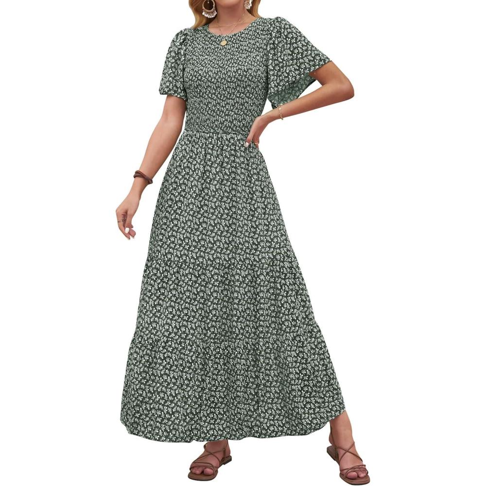 Get more for your money with our exclusive bundle deals on ZESICA Women’s 2025 Summer Casual Floral Print Short Flutter Sleeve Crew Neck Smocked High Waist Flowy Maxi Dress(Olive) and accessories.