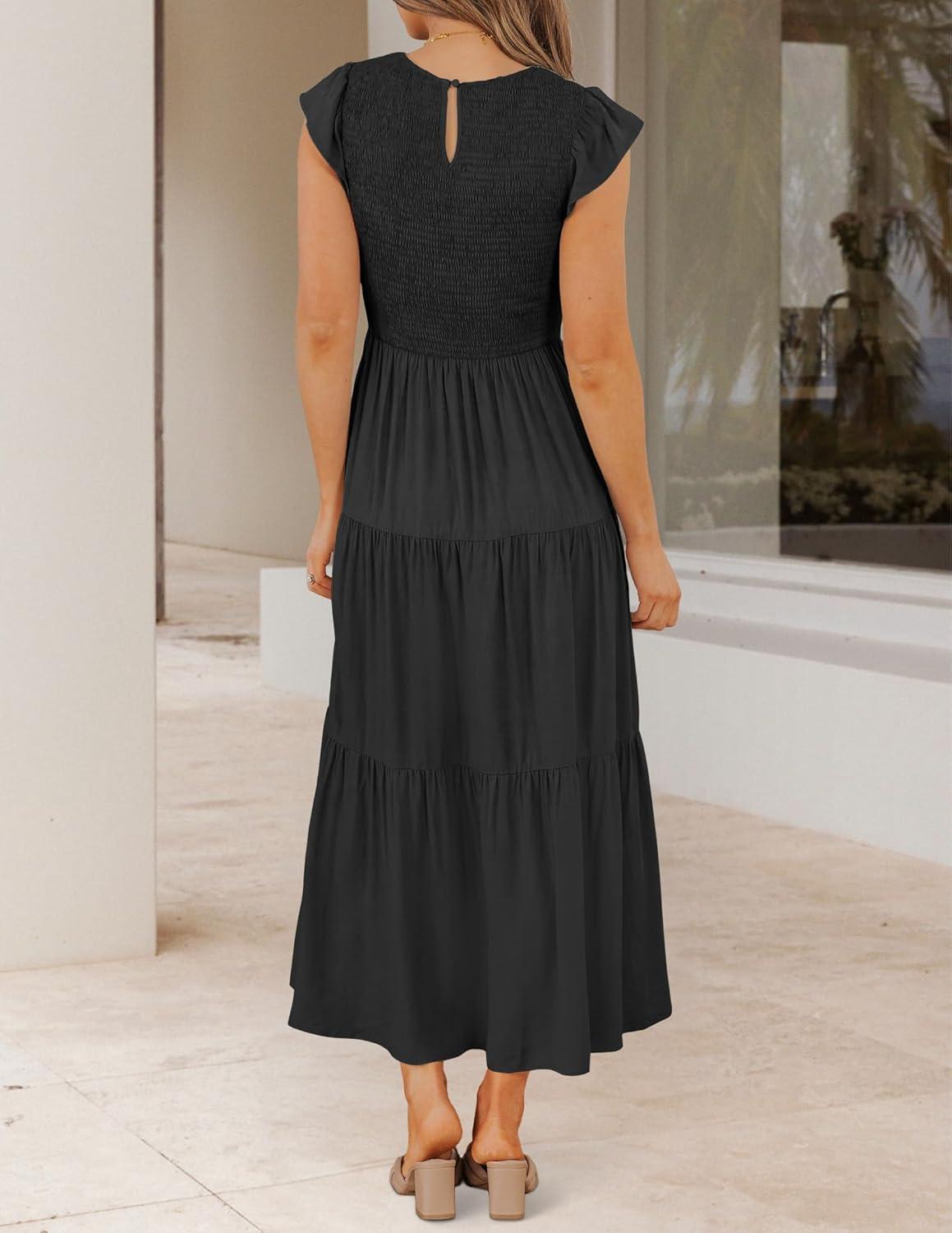 ZESICA Women’s 2025 Summer Casual Flutter Short Sleeve Crew Neck Smocked Elastic Waist Tiered Midi Dress(Black)
