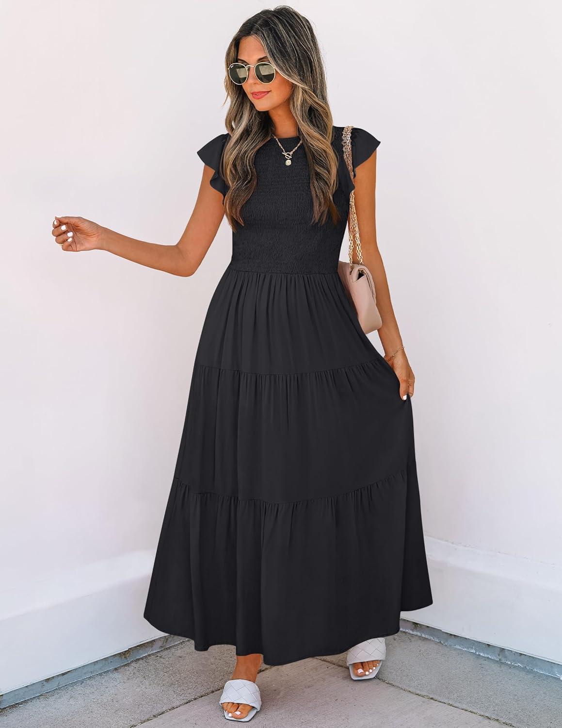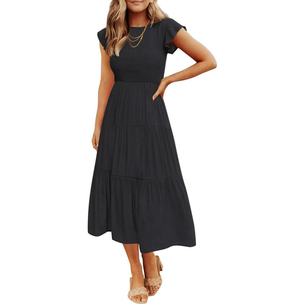 Discover the latest ZESICA Women’s 2025 Summer Casual Flutter Short Sleeve Crew Neck Smocked Elastic Waist Tiered Midi Dress(Black) from and take advantage of our limited-time introductory offer.