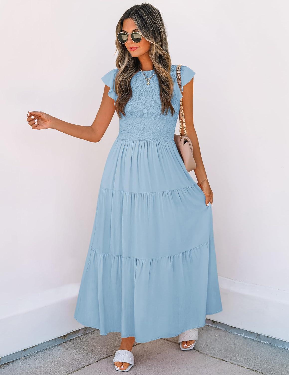 ZESICA Women's 2025 Summer Casual Flutter Short Sleeve Crew Neck Smocked Elastic Waist Tiered Midi Dress(Blue)