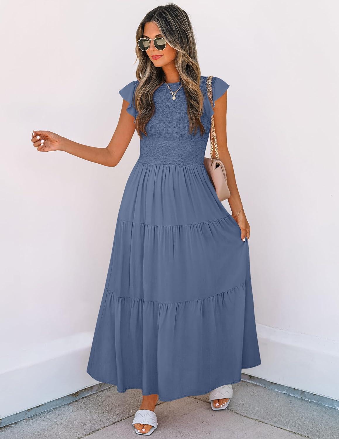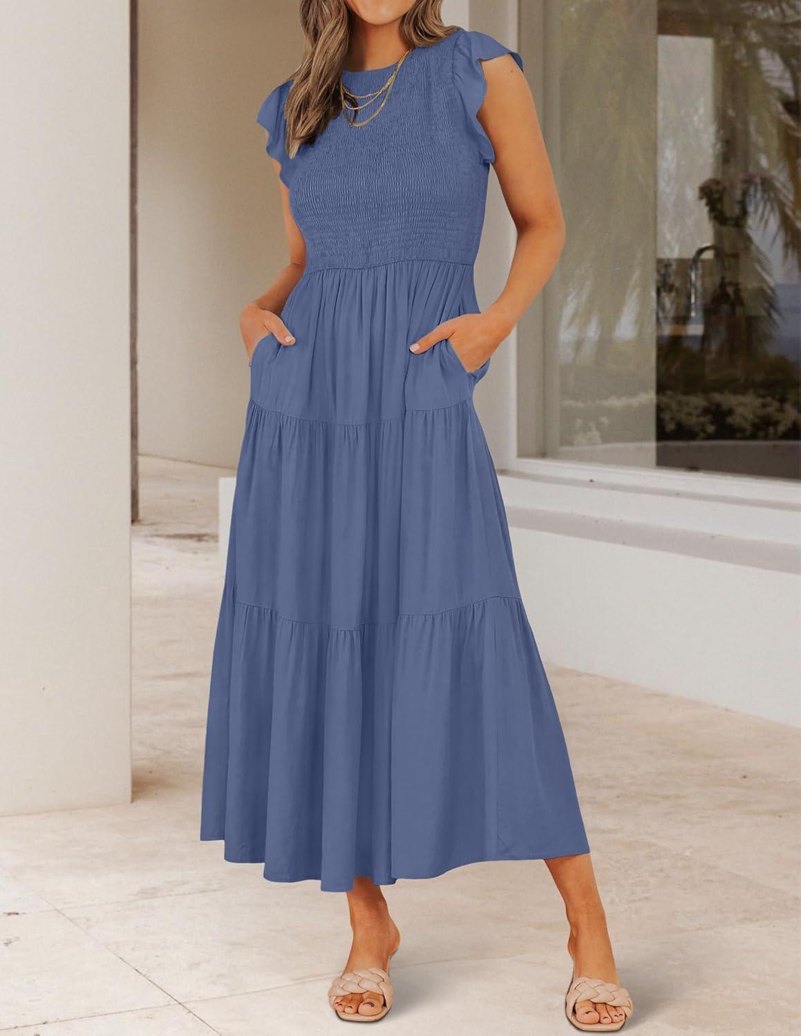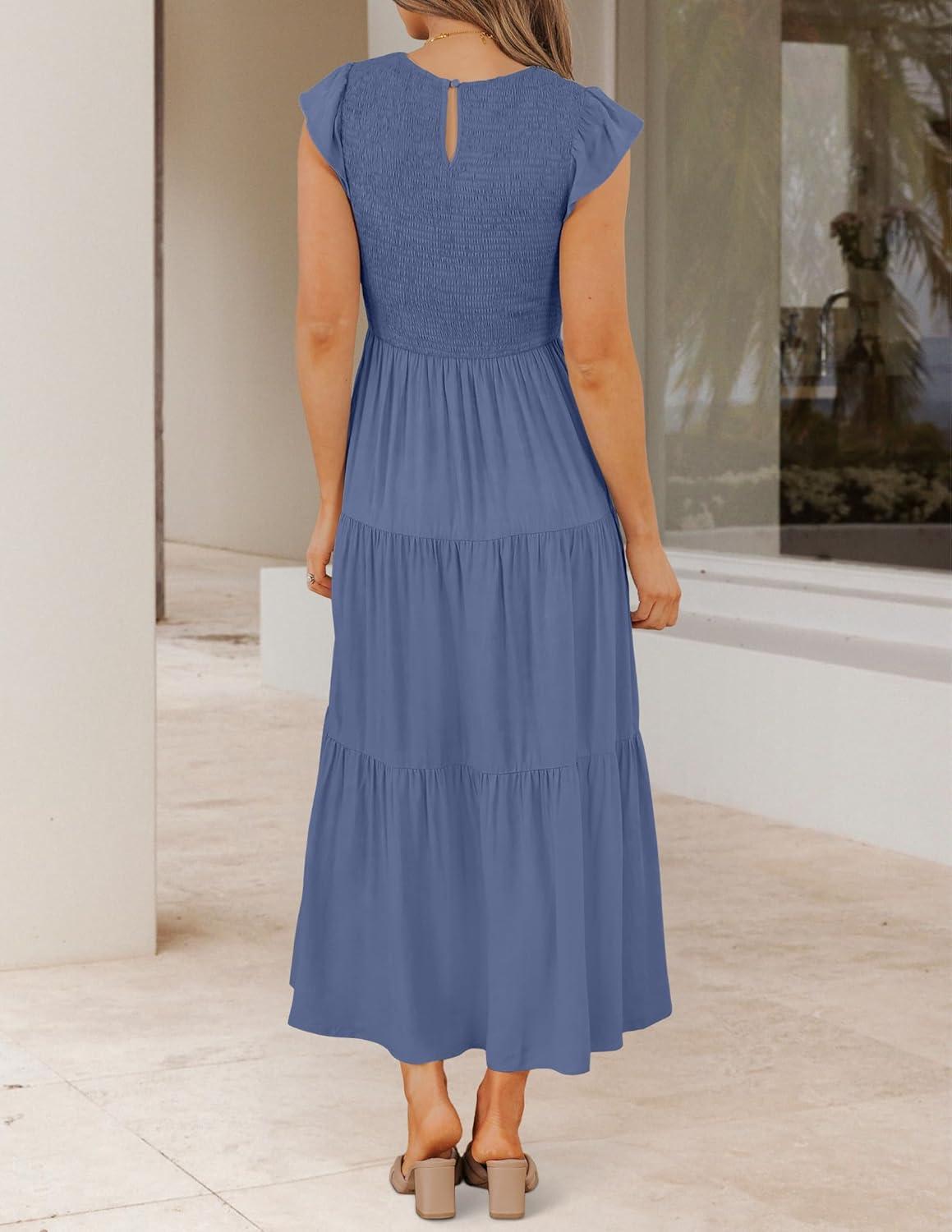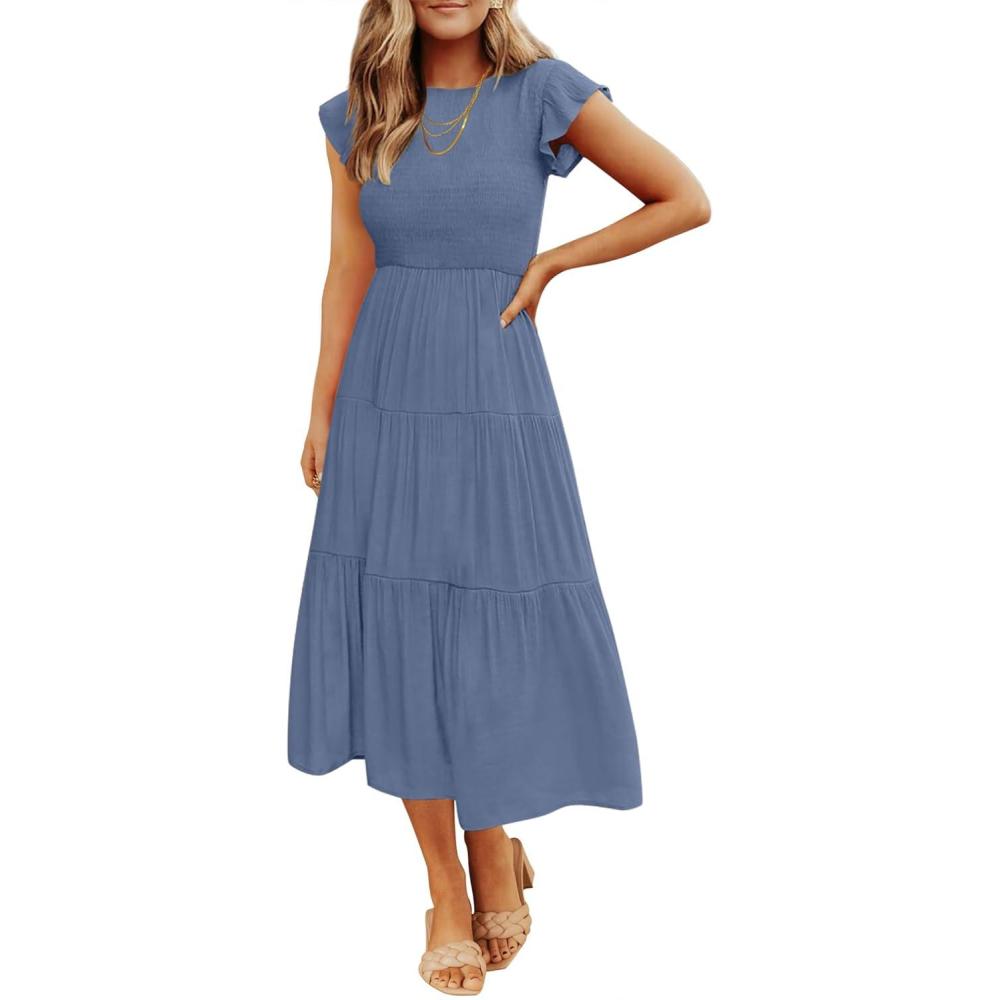 ZESICA Women’s 2025 Summer Casual Flutter Short Sleeve Crew Neck Smocked Elastic Waist Tiered Midi Dress(Dusty Blue)