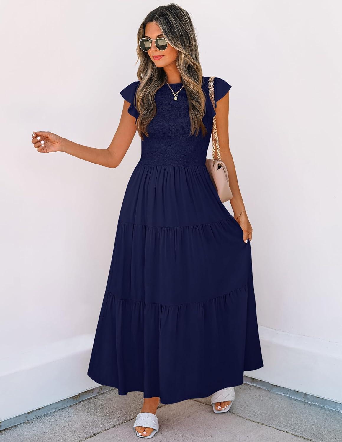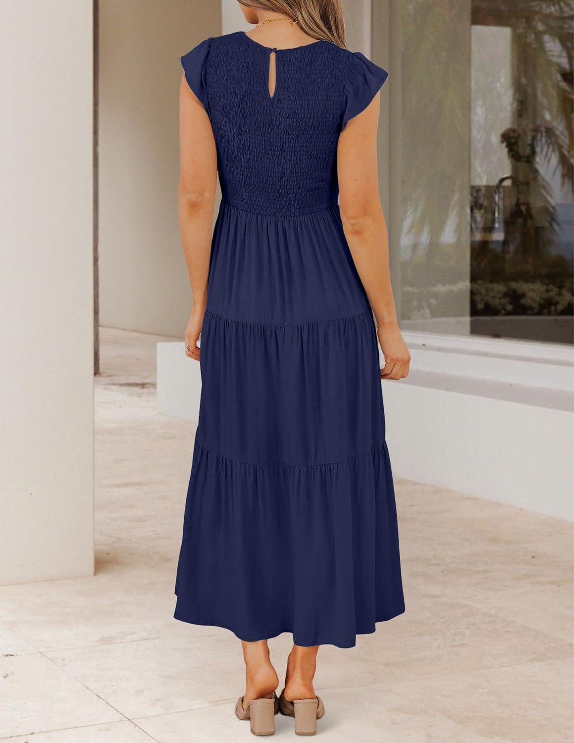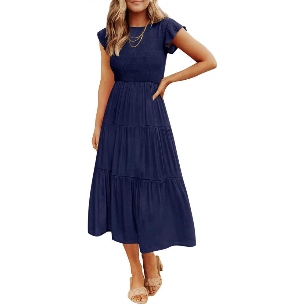 ZESICA Women’s 2025 Summer Casual Flutter Short Sleeve Crew Neck Smocked Elastic Waist Tiered Midi Dress(Royal Blue)