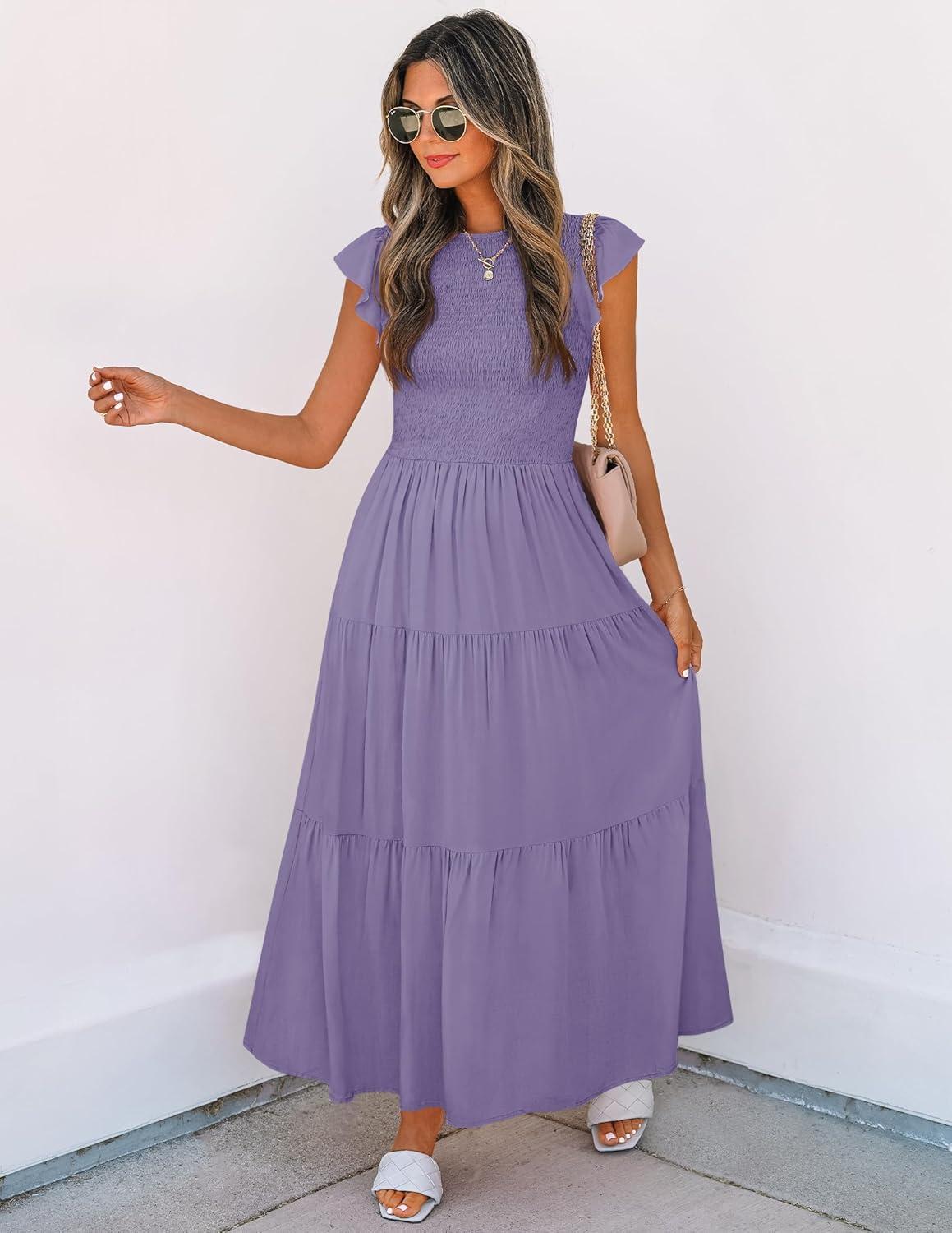 ZESICA Women’s 2025 Summer Casual Flutter Short Sleeve Crew Neck Smocked Elastic Waist Tiered Midi Dress(Violet)