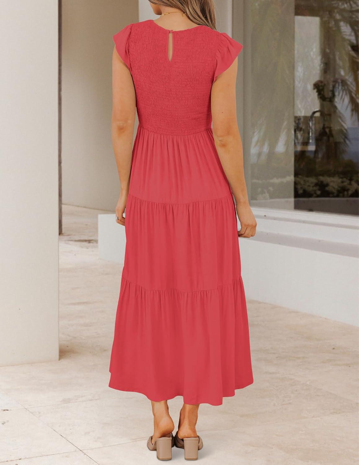 ZESICA Women's 2025 Summer Casual Flutter Short Sleeve Crew Neck Smocked Elastic Waist Tiered Midi Dress(Watermelonred)