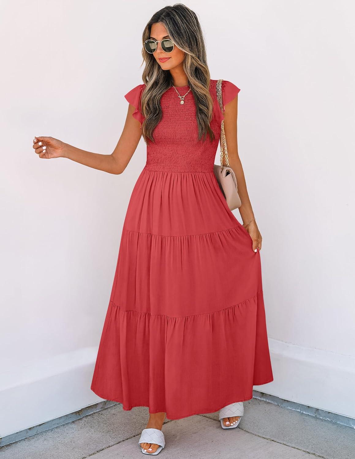 ZESICA Women’s 2025 Summer Casual Flutter Short Sleeve Crew Neck Smocked Elastic Waist Tiered Midi Dress(Watermelonred)