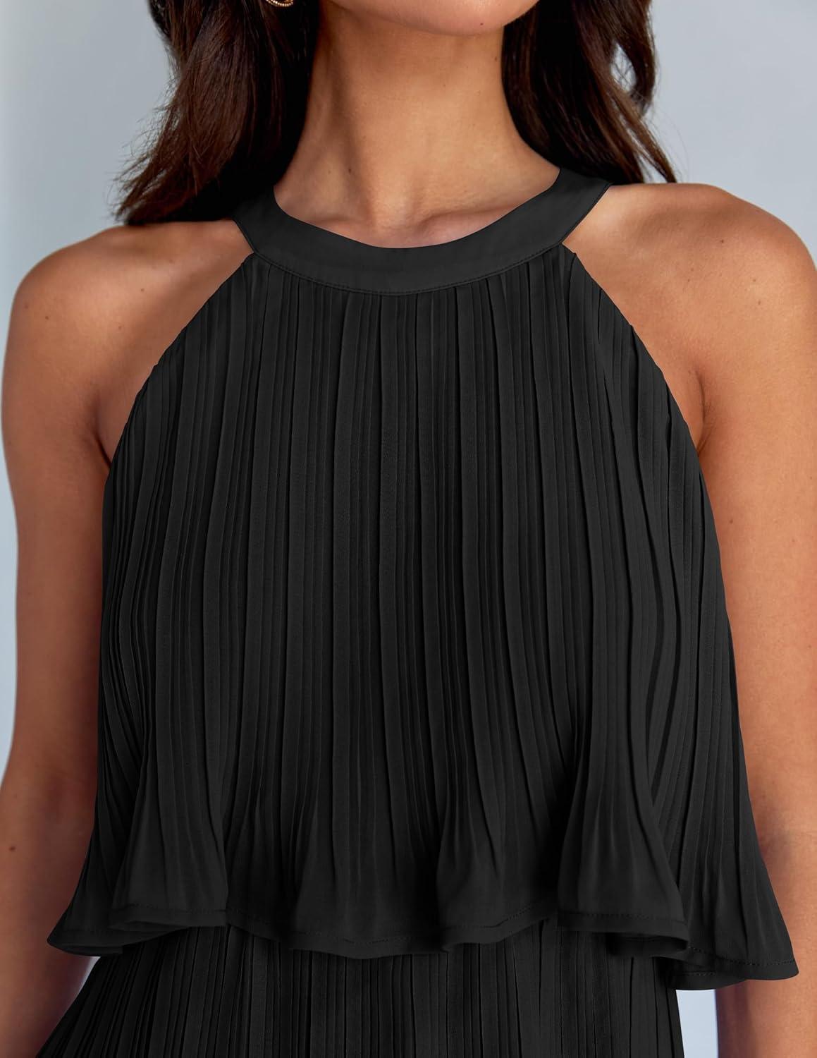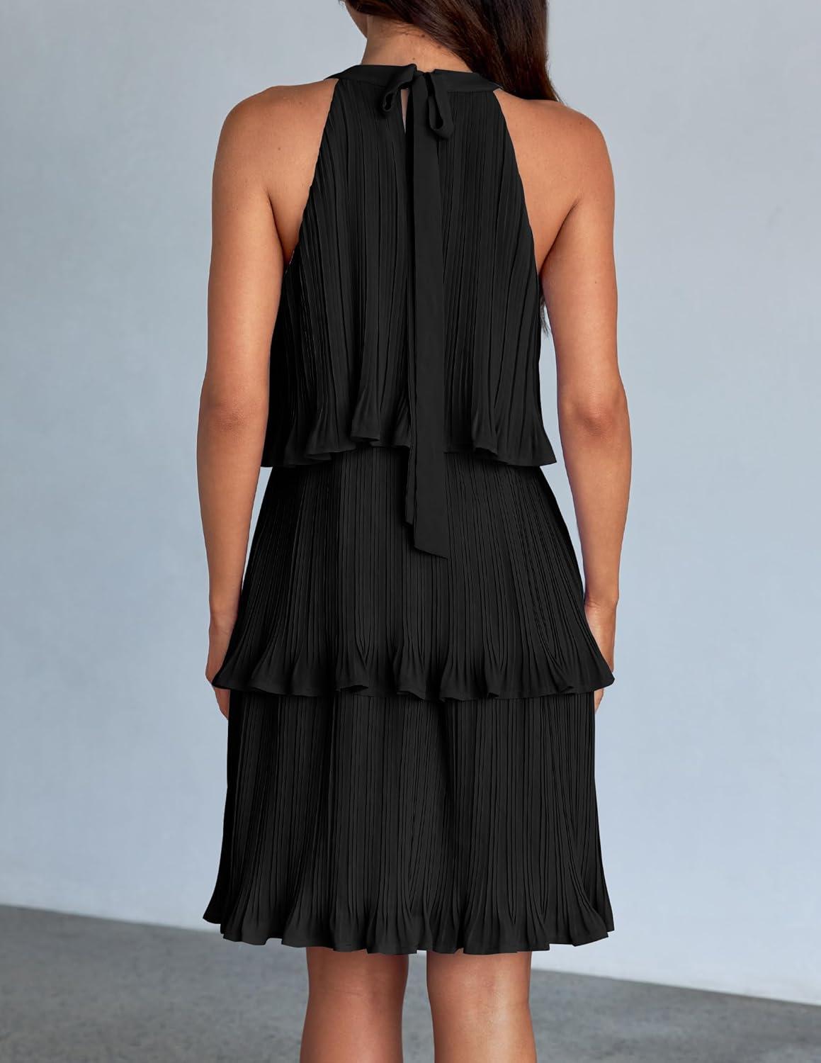 ZESICA Women’s 2025 Summer Halter Dresses Sleeveless Ruffle Tiered Layered Chiffon Pleated A Line Swing Mini Dress(Dark Black)