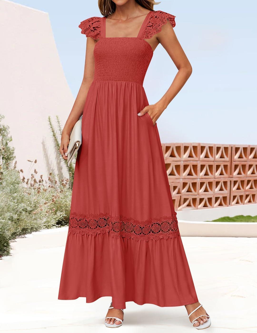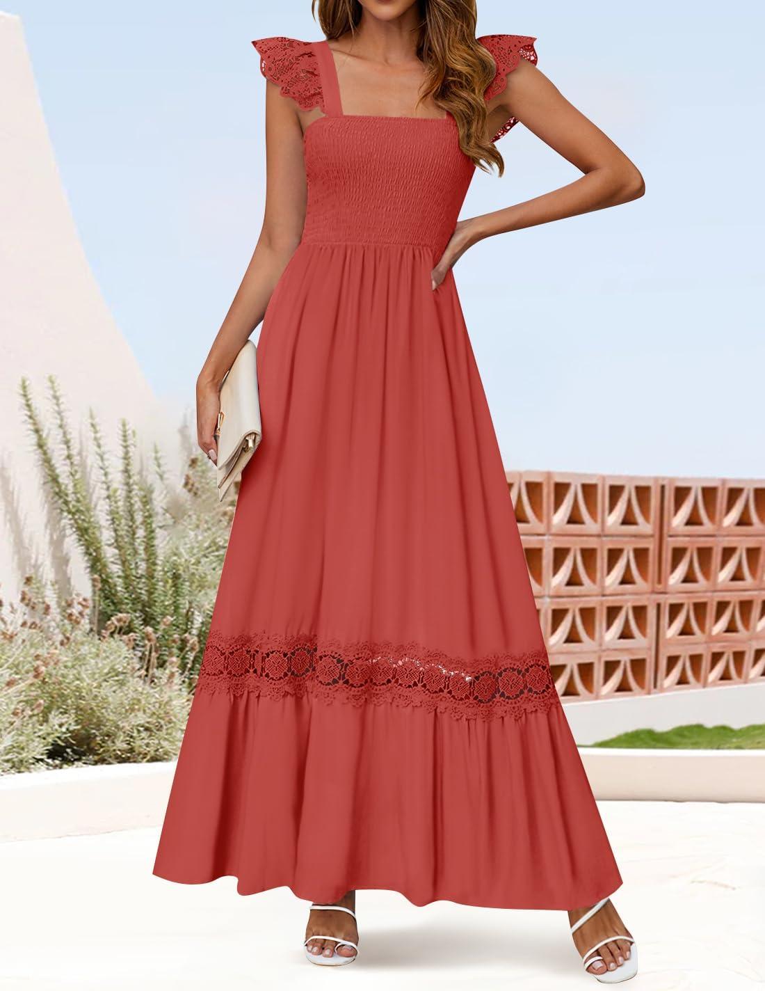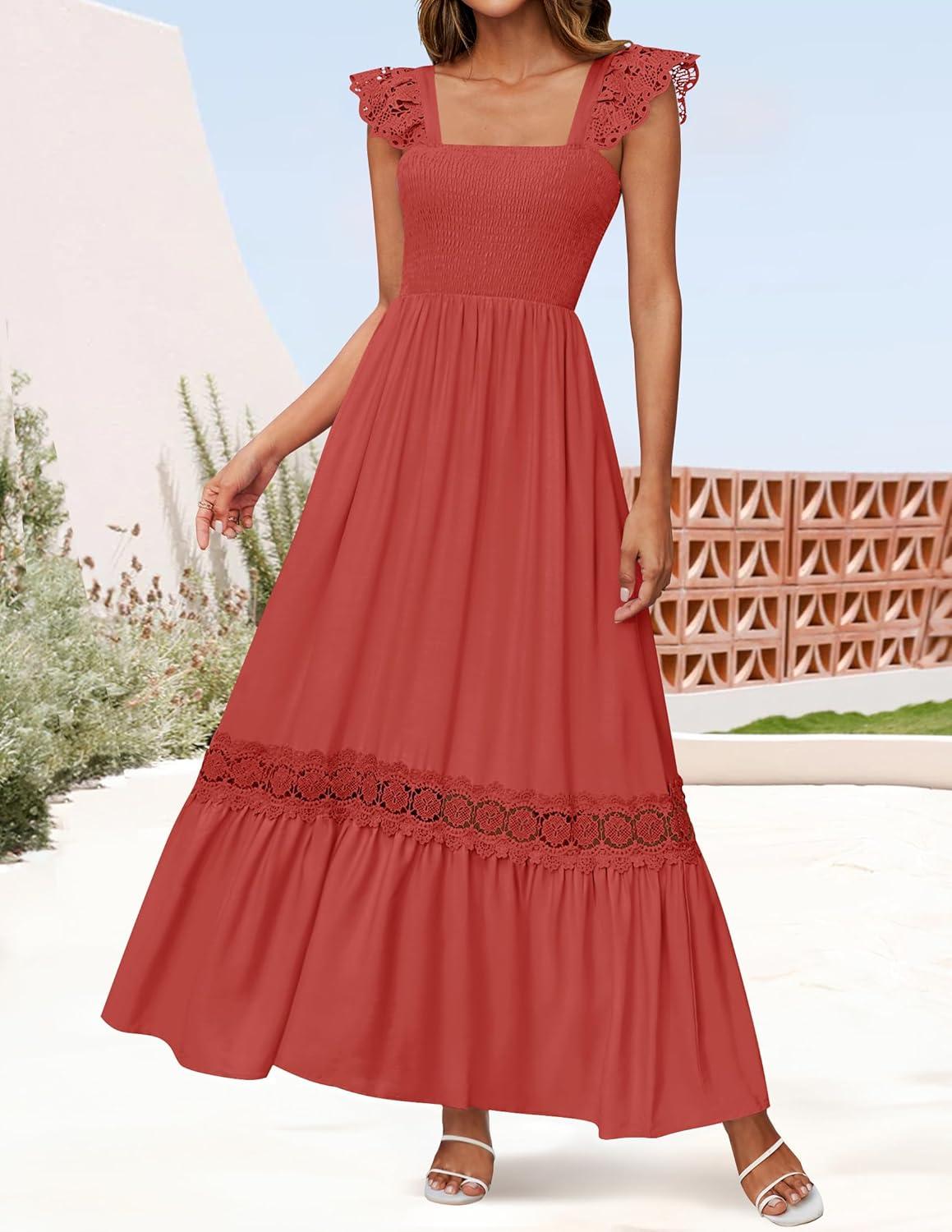 ZESICA Women’s 2025 Summer Lace Strap Sleeveless Square Neck Smocked High Waist Ruffle Hollow Out Flowy A Line Maxi Dress(Rust)