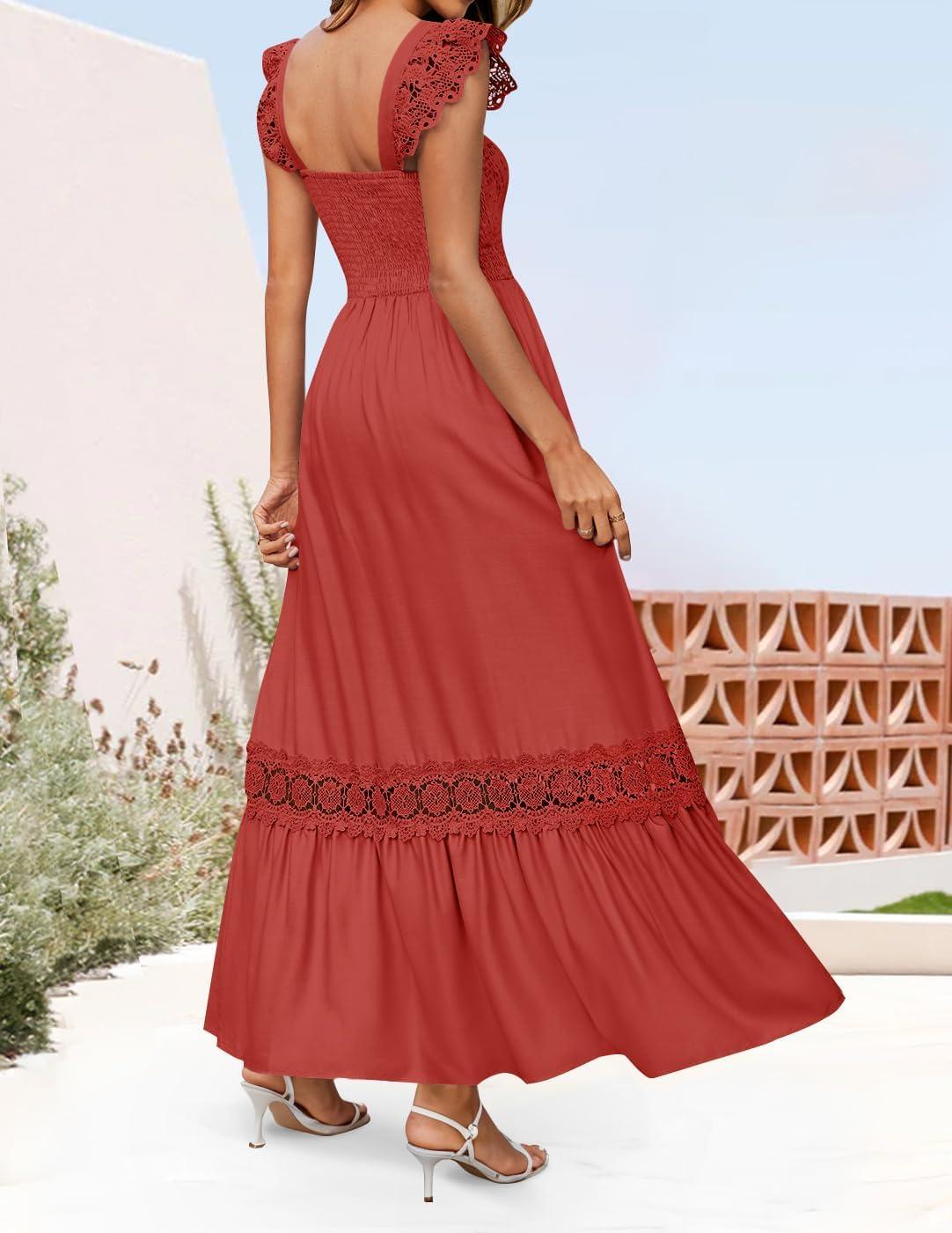 ZESICA Women's 2025 Summer Lace Strap Sleeveless Square Neck Smocked High Waist Ruffle Hollow Out Flowy A Line Maxi Dress(Rust)