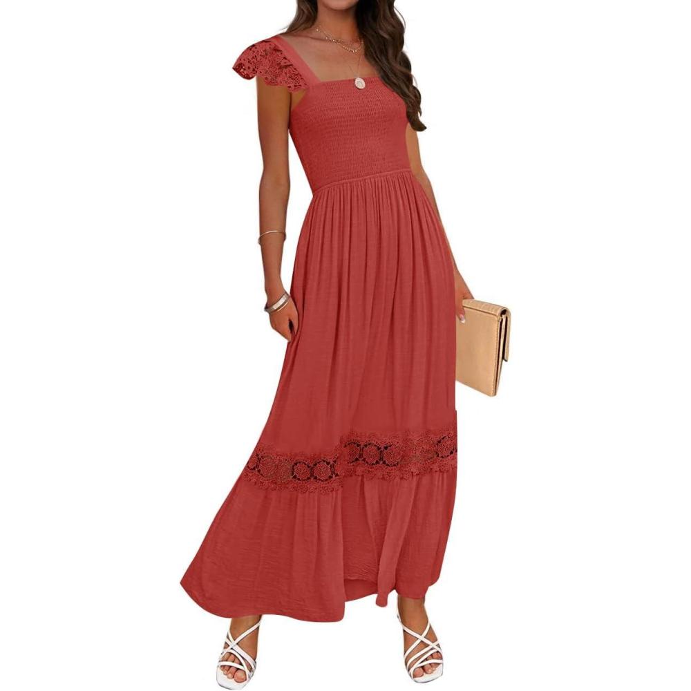 Be the first to review “ZESICA Women’s 2025 Summer Lace Strap Sleeveless Square Neck Smocked High Waist Ruffle Hollow Out Flowy A Line Maxi Dress(Rust)”