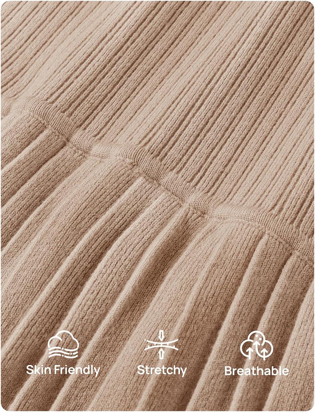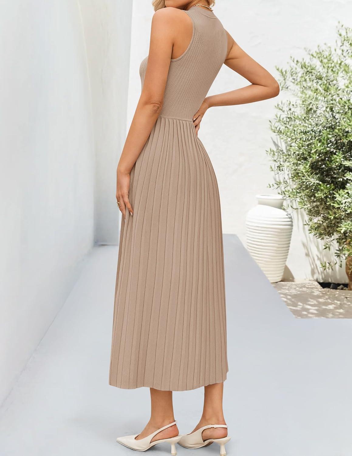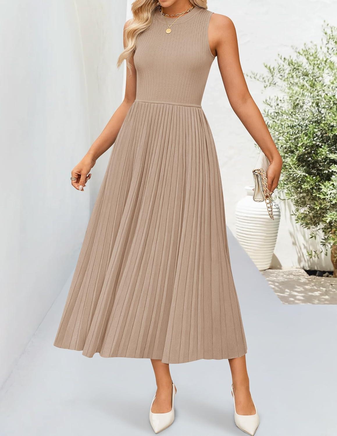 ZESICA Women’s 2025 Summer Sleeveless Midi Dresses Casual Crewneck Ribbed Knit Pleated A Line Swing Long Party Dress(Khaki)