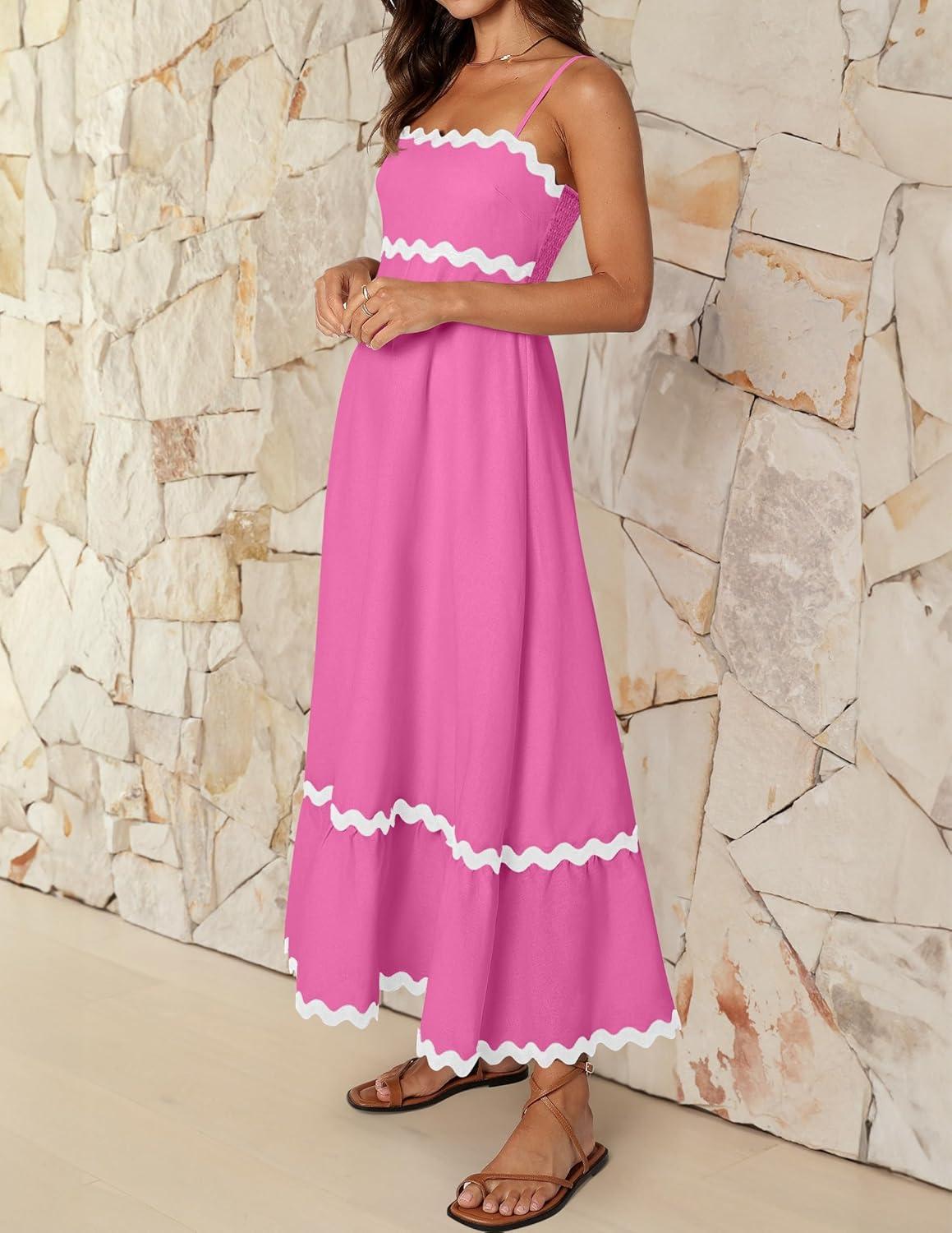 ZESICA Women’s 2025 Summer Spaghetti Straps Sleeveless Backless Sundress Flowy Smocked Lace Swing A Line Midi Dress(Rose Pink)