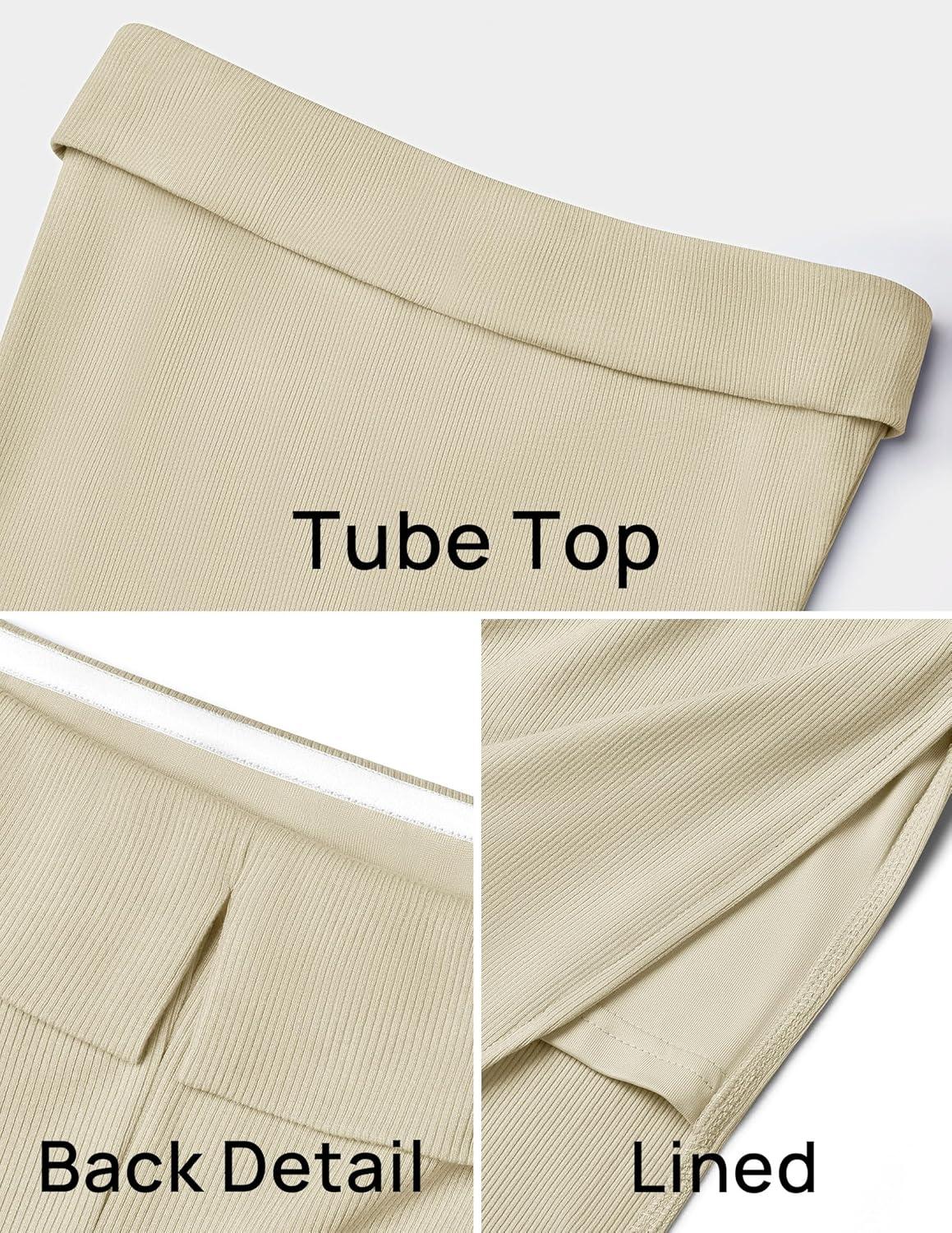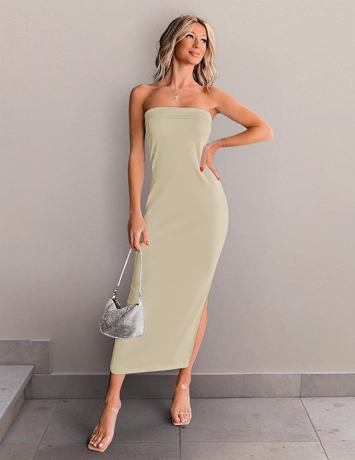 ZESICA Women’s 2025 Summer Strapless Bodycon Midi Dress Off Shoulder Sleeveless Side Slit Tube Long Club Party Dresses(Sand)