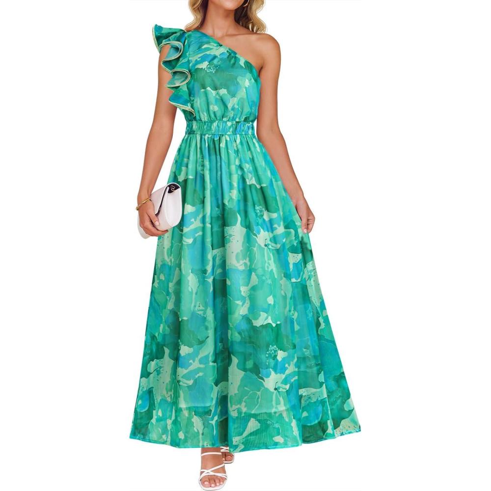 ZESICA Women’s 2026 Boho Floral Sleeveless Maxi Dress Ruffle One Shoulder Elatsic High Waist Beach Party Long Dresses(Green)