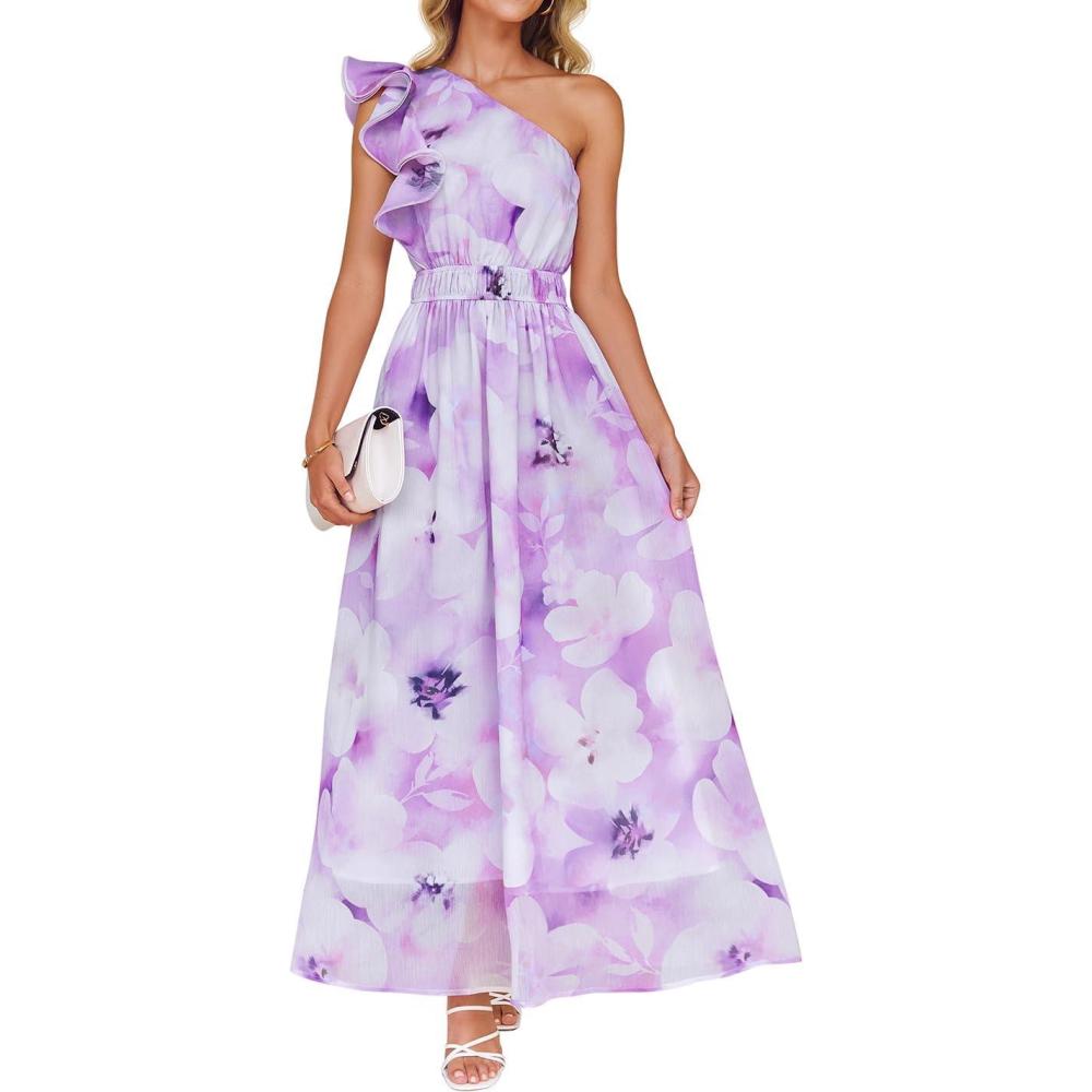 ZESICA Women’s 2026 Boho Floral Sleeveless Maxi Dress Ruffle One Shoulder Elatsic High Waist Beach Party Long Dresses(Purple)