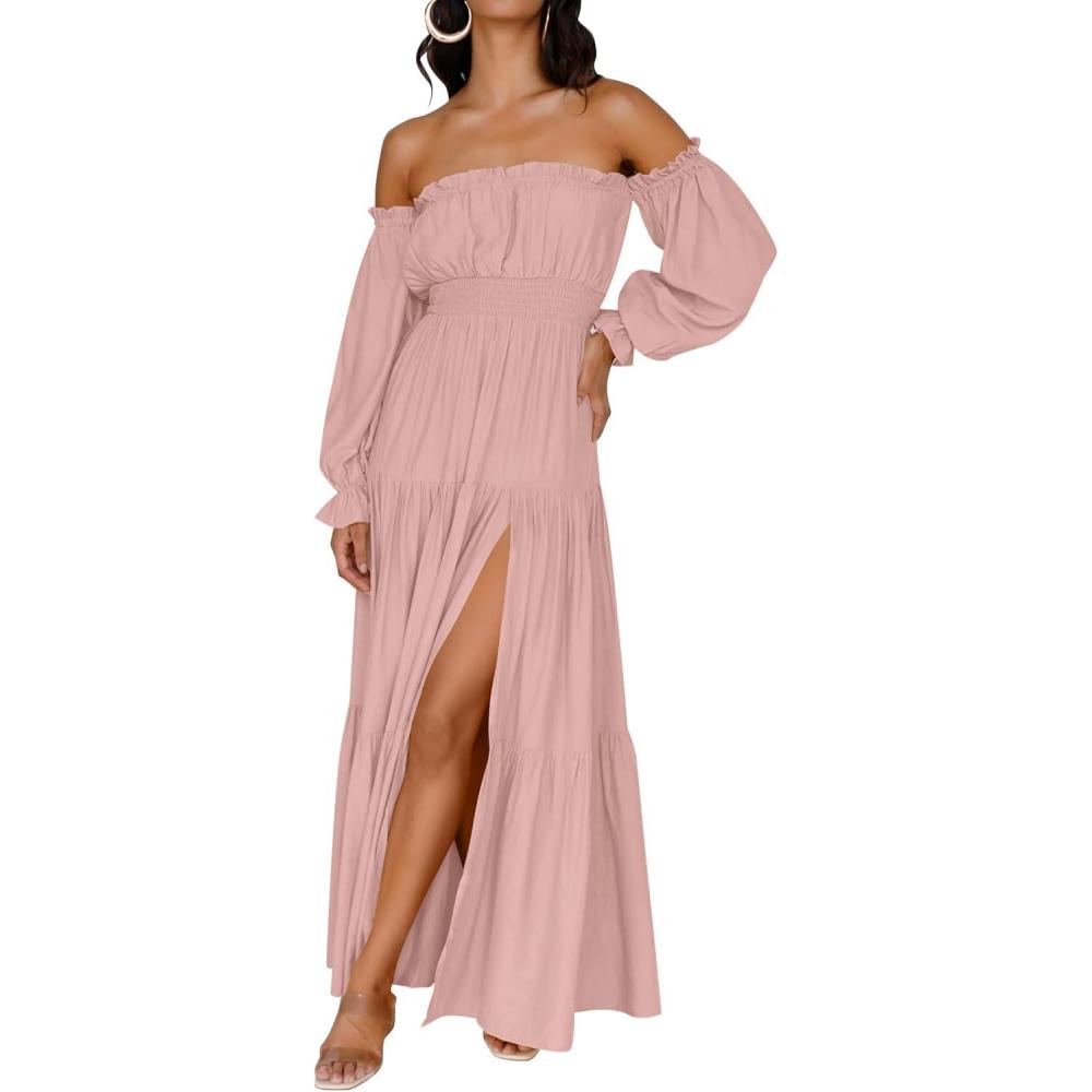 ZESICA Women’s 2026 Boho Sexy Off Shoulder Long Sleeve Smocked High Waist Side Split Flowy A Line Tiered Long Maxi Dress(Pink)