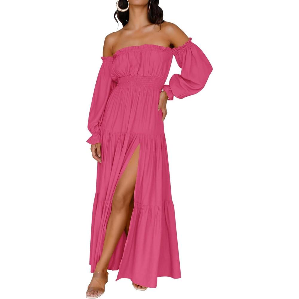 ZESICA Women’s 2026 Boho Sexy Off Shoulder Long Sleeve Smocked High Waist Side Split Flowy A Line Tiered Long Maxi Dress(Pink)