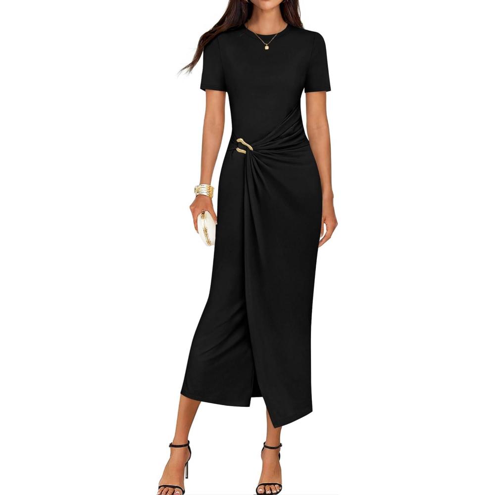 ZESICA Women’s 2026 Summer Short Sleeve Bodycon Midi Dress Crewneck Ruched Wedding Guest Cocktail Party Long Dresses(Black)