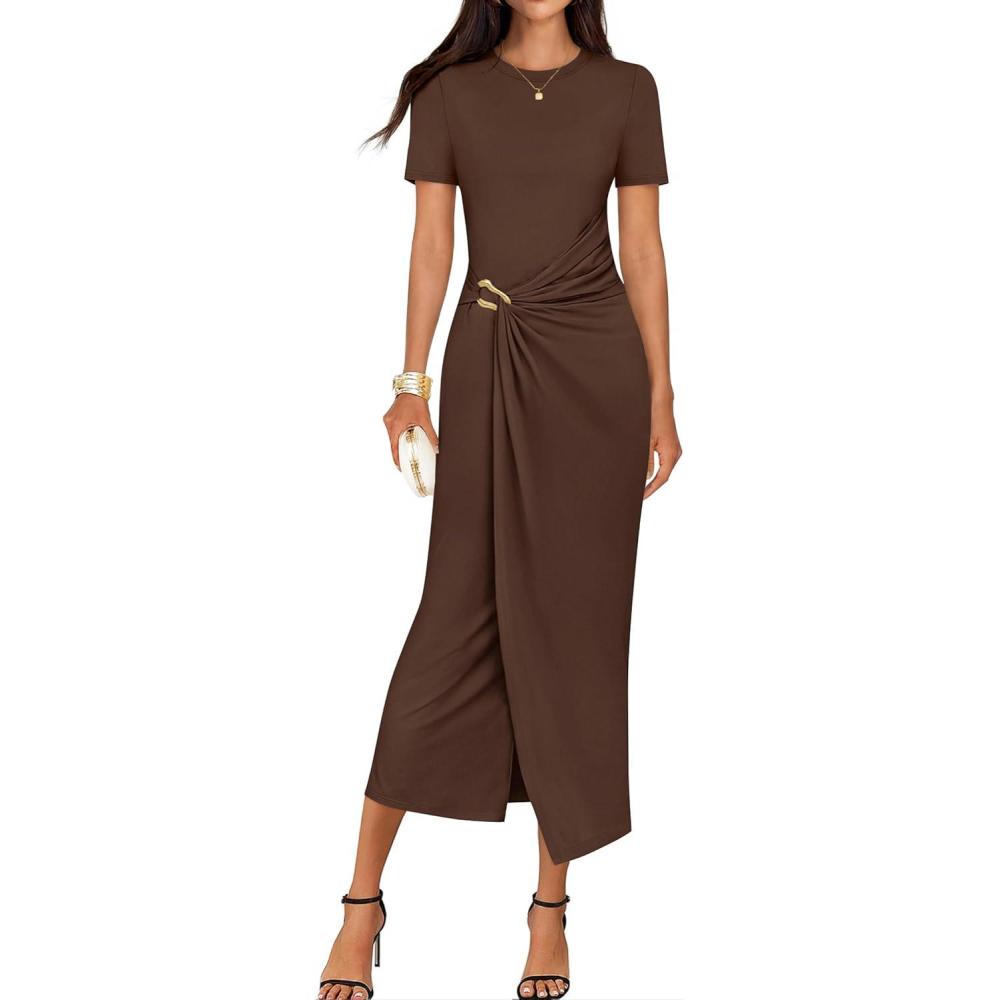 ZESICA Women’s 2026 Summer Short Sleeve Bodycon Midi Dress Crewneck Ruched Wedding Guest Cocktail Party Long Dresses(Coffee)