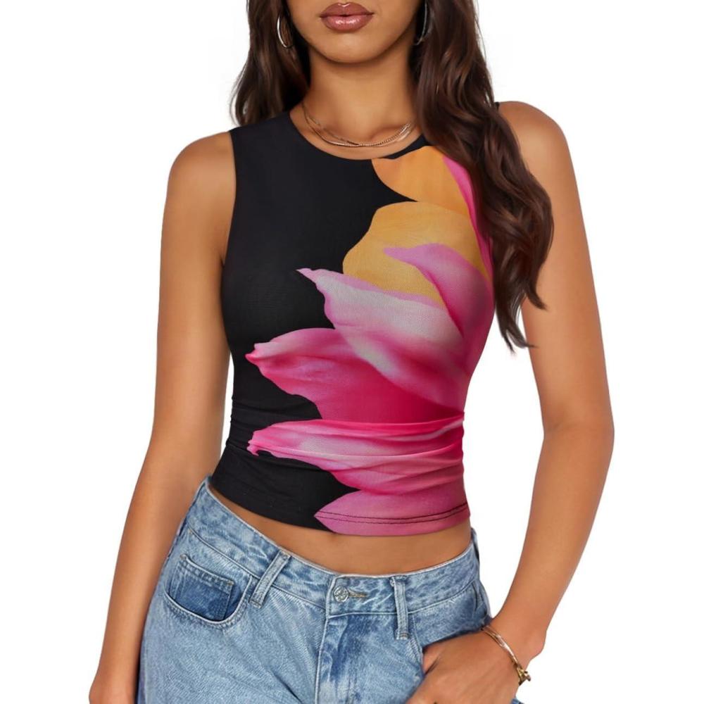 ZESICA Women’s 2026 Summer Sleeveless Floral Tank Tops Mesh Y2K Crop Going Out Outfits Beach Vacation Trendy Clothes(Black)