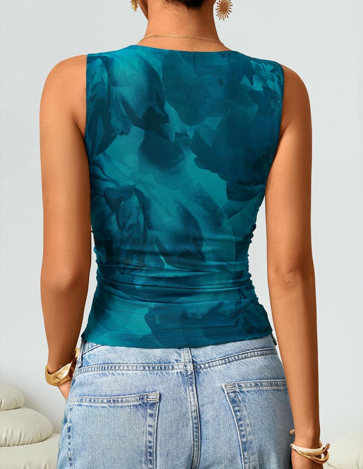 ZESICA Women’s 2026 Summer Sleeveless Floral Tank Tops Mesh Y2K Crop Going Out Outfits Beach Vacation Trendy Clothes(Blue)
